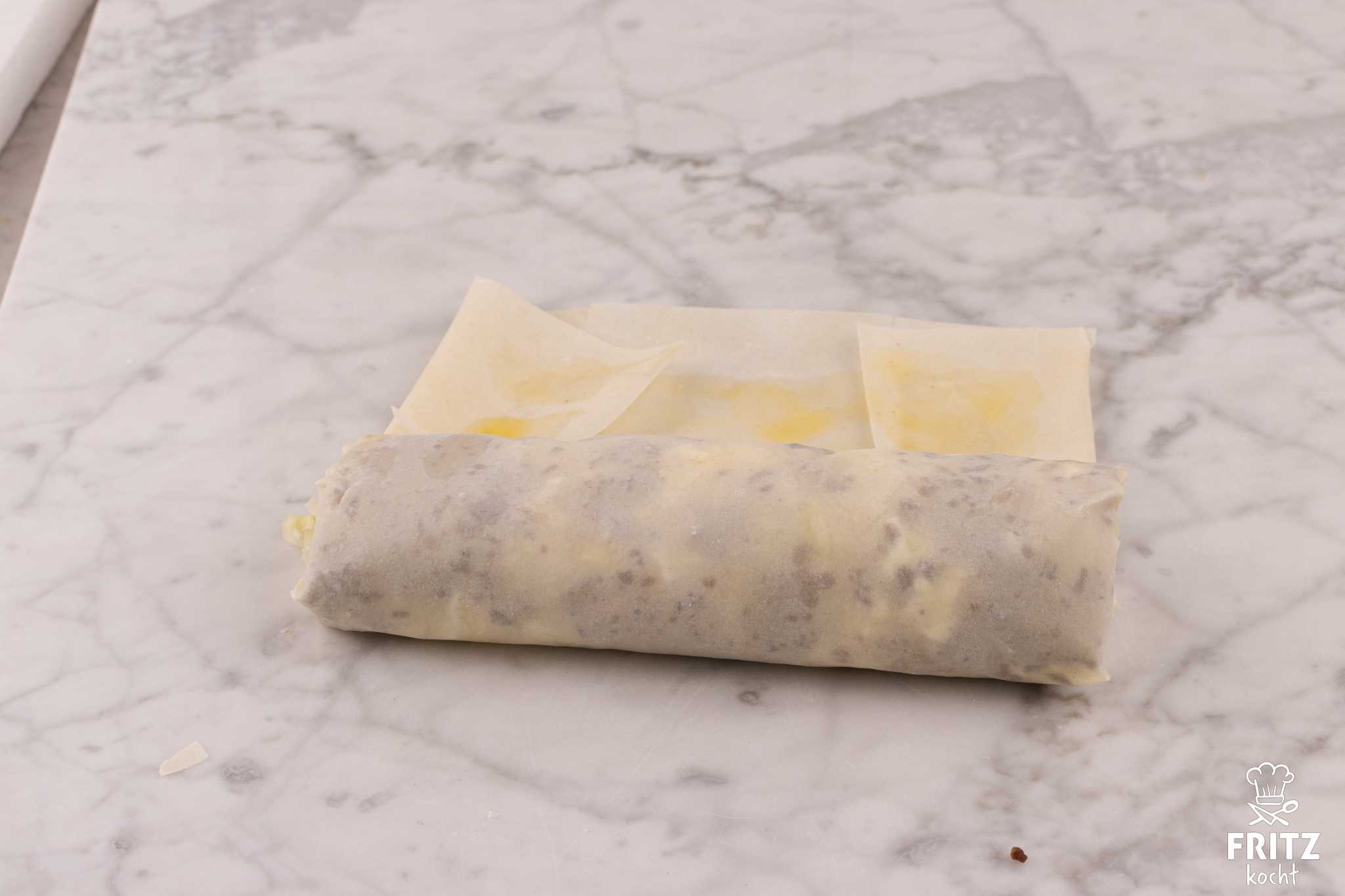 - Nun legt ihr vor euch ein Teigblatt, bestreicht es mit flüssiger Butter. In der Mitte verteilt ihr dann etwas Hackfleisch (siehe Fotos) gebt dann vom Weißkohl darüber und zerkrümmelt zum Schluss etwas Fetakäse über alles. Jetzt schlagt ihr die Seiten ein Stück Richtung Mitte um (Siehe Fotos) bestreicht die umgeklappten Teigränder wieder mit etwas Butter und rollt den ganzen Börek auf. Zum Schluss bestreiche ich ihn mit etwas Eigelb und streue schwarzen Sesam darüber. Das macht ihr mit allen Blättern und der ganzen Füllung.