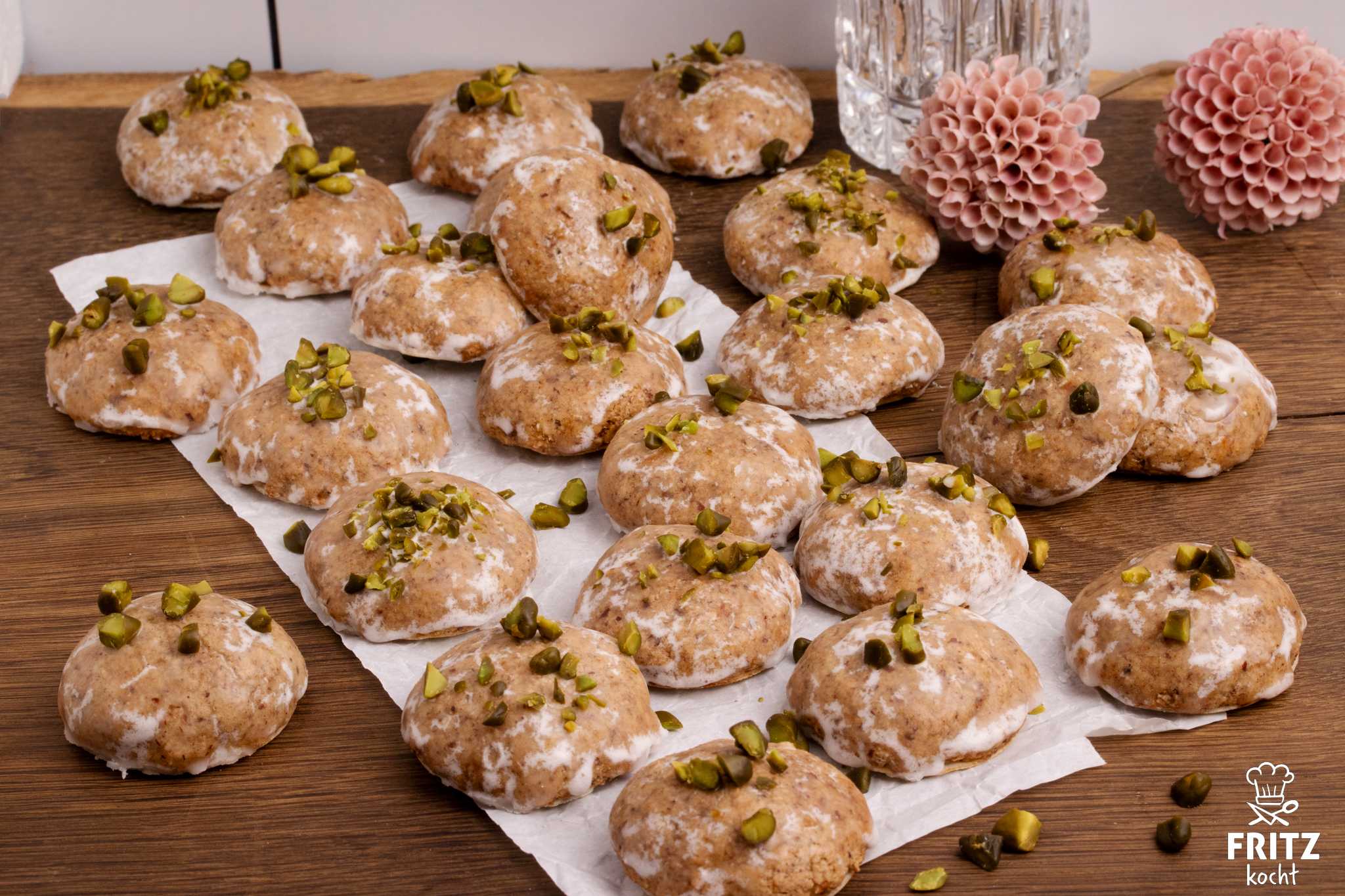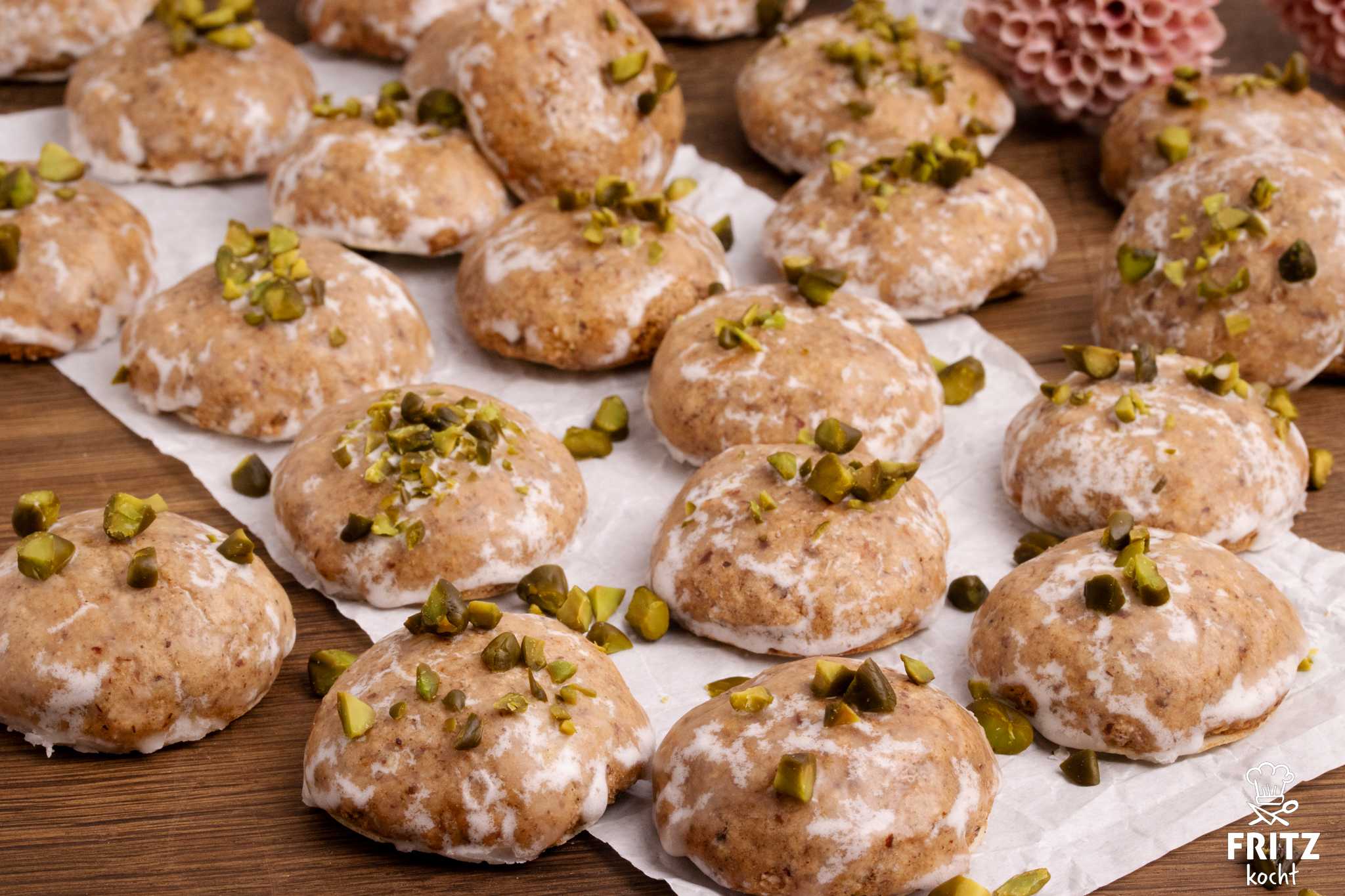 - Am nächsten Tag den Backofen auf Ober-Unterhitze 150°C vorheizen. Die Lebkuchen in der Ofenmitte 15 Minuten backen. In dieser Zeit 6 Esslöffel Puderzucker mit dem Saft 1/2 Zitrone zu einer Glasur verrühren und die 40 Gramm Schokolade schmelzen. Je nach Geschmack die Hälfte der noch heißen Lebkuchen mit der Zitronenglasur bestreichen und mit ein paar gehackten Pistazien bestreuen. Die restlichen Lebkuchen abkühlen lassen, mit der weichen Schokolade glasieren und mit gehackten Mandeln bestreuen. Ihr könnt natürlich auch alle mit Schokolade oder alle mit Zitronenglasur bestreichen. Dann müsst ihr nur die doppelte Menge Schoko oder Zitronenglasur nehmen.