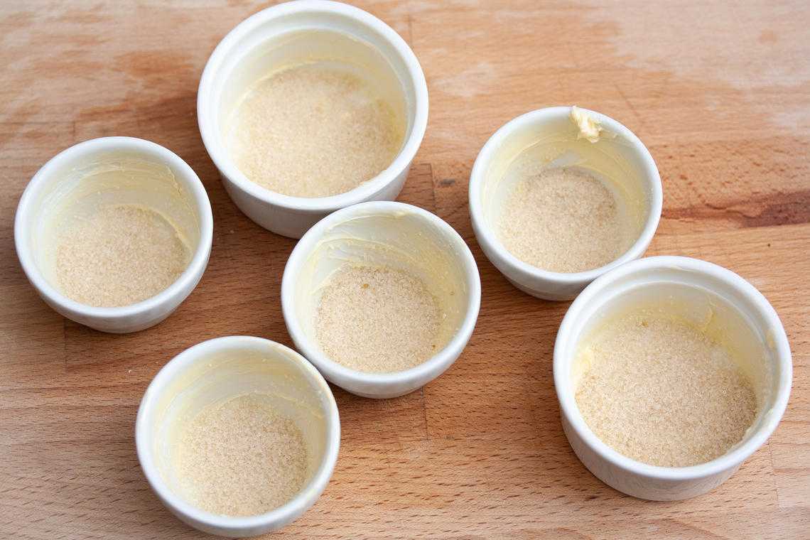- Backform oder mehrer Förmchen dick mit weicher Butter bestreichen. Das geht am besten und schnellsten mit den Fingern. Den Boden der Förmchen mit weißem oder braunen Zucker bestreuen. Siehe Foto.