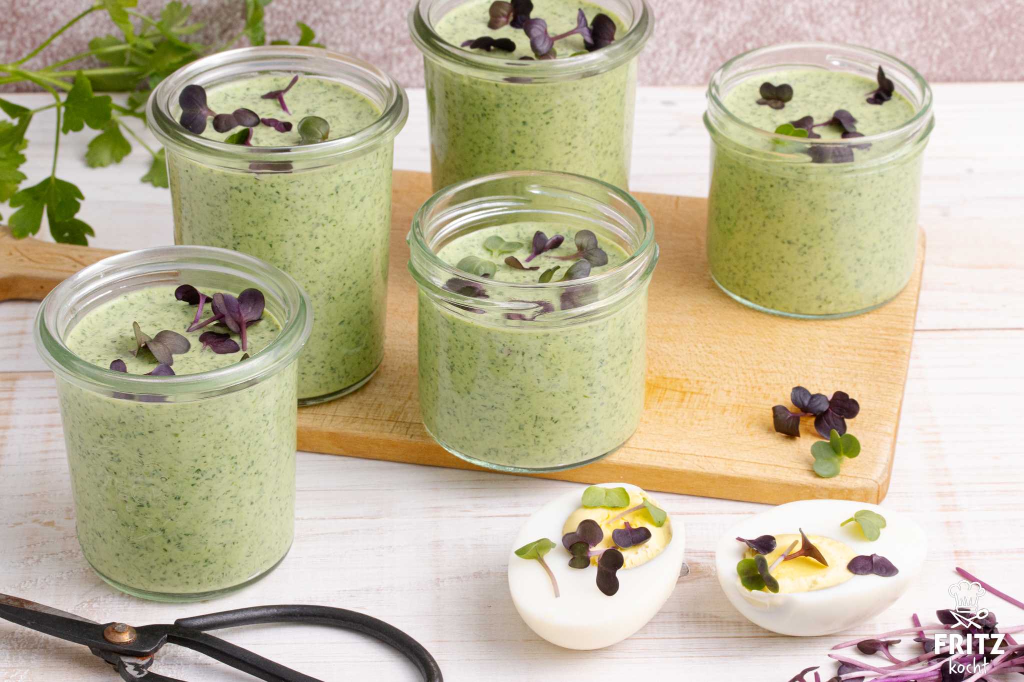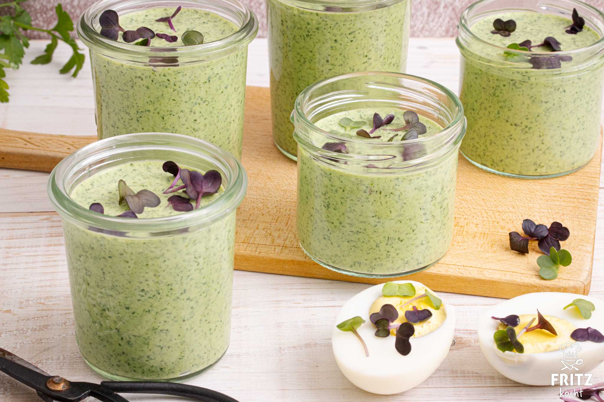 Jeder macht diese Soße ein bisschen anders, der eine meint so, der andere meint so. Ihr könnt einfach die Kräuter nehmen, die euch schmecken....