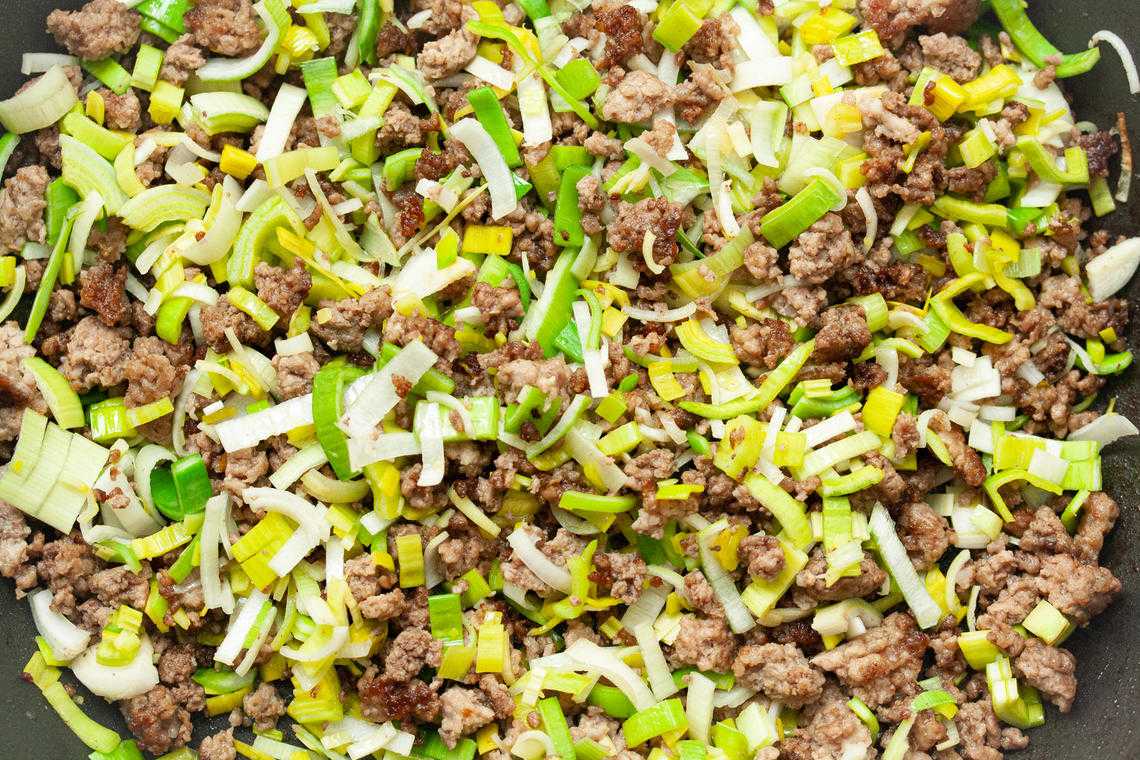 - 250 Gramm Hackfleisch mit den 2 Esslöffeln Öl und etwas Geduld anbraten. Ihr müsst das Hack immer wieder wenden und gleichzeitig zerkleinern, so dass am Ende kleine, kross gebratene Hackkrümmel in der Pfanne sind. Das kann schon mal 10-15 Minuten dauern, da erst die Flüssigkeit verdunsten muss, damit dann das Hack richtig braten kann. Es macht am Ende knisternde Geräusche, dann ist es gut!