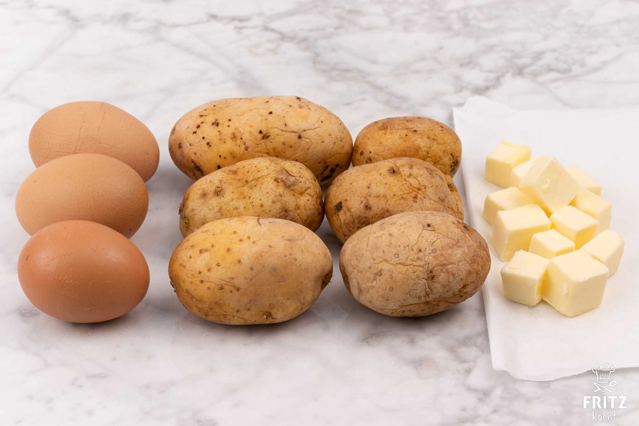 - 50 Gramm weiche Butter, 1 Ei und 1 Eigelb unter die heißen Kartoffeln mischen. Da die Kartoffeln noch heiß sind, schmilzt die Butter. Zum Schluß mit frisch geriebener Muskatnuss und Salz abschmecken.
