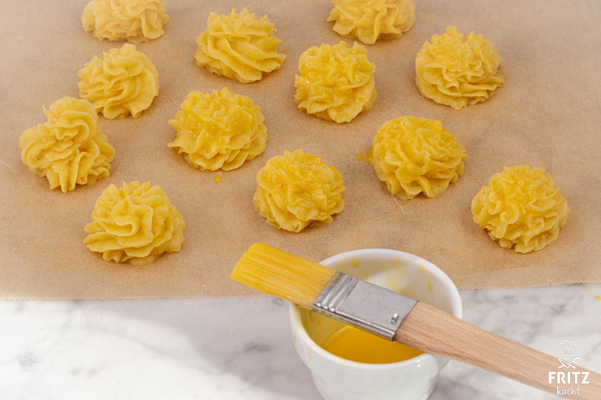 - Zum Schluss und da müsst ihr bitte ganz vorsichtig arbeiten, bestreicht beziehungsweise betupft ihr die Herzoginkartoffeln mit etwas Eigelb. Ich nehme dazu einen kleine Pinsel.