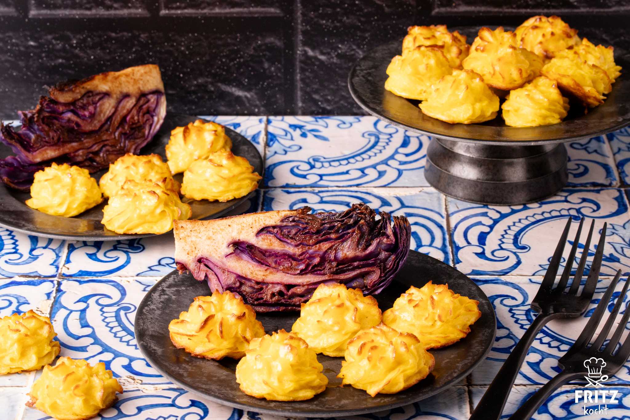 - Die Herzogin-Kartoffeln ca.12 Minuten in der Ofenmitte goldgelb backen.Das Video zu diesem Rezept findet ihr auf meinen Social Media Kanälen. Folgt mir gerne um kein Rezept mehr zu verpassen.