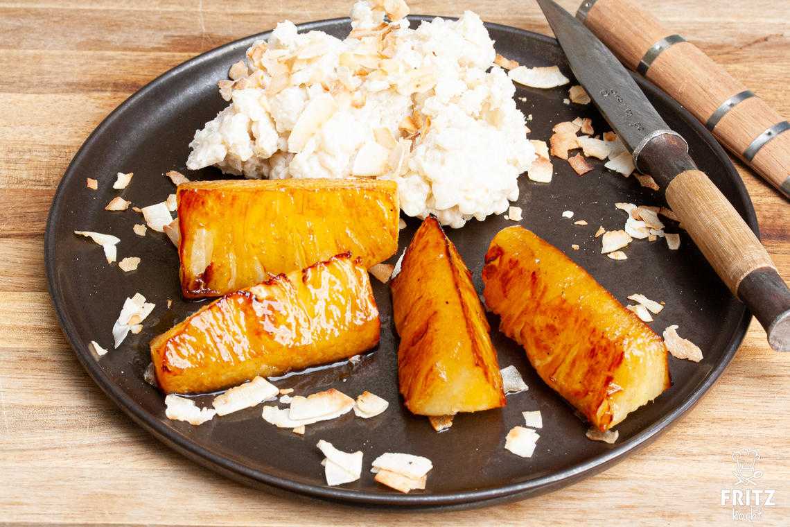 Mit Honig geschmorte frische Ananas, dazu Kokos Milchreis und alles mit Kokoschips getoppt, schmeckt unglaublich lecker.