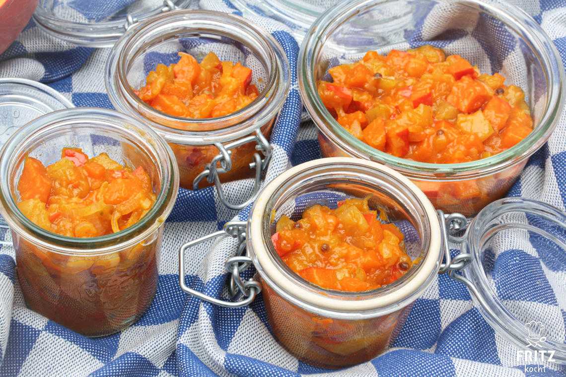 - Zur Aufbewahrung alte Schraubgläser und Deckel mit kochendem Wasser füllen und 10 min stehen lassen. Vorsicht, alles heiß!!! Dann das kochendheiße Chutney einfüllen und verschließen, ein paar Minuten auf den Kopf stellen und abkühlen lassen. Bei mir hält das Chutney so ein Jahr, aber es wird vorher aufgegessen ;)