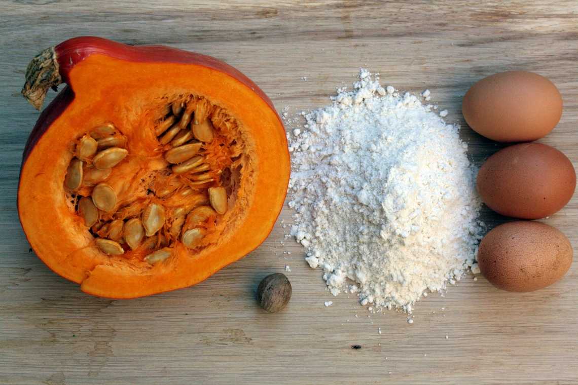 - In das Kürbispuree gebt ihr nun 2 Eigelb und hebt vorsichtig 100 Gramm Kartoffelmehl, 1 Teelöffel Salz, etwas Muskatnuss und Pfeffer unter. Nun lasst ihr den Teig 1/2 Stunde im Kühlschrank ruhen. Das ist wichtig, da der Teig sich dann besser verarbeiten lässt. (Mit den Eiweiß könnt ihr Baiser, Eiweißküchlein, Zimtsterne backen)