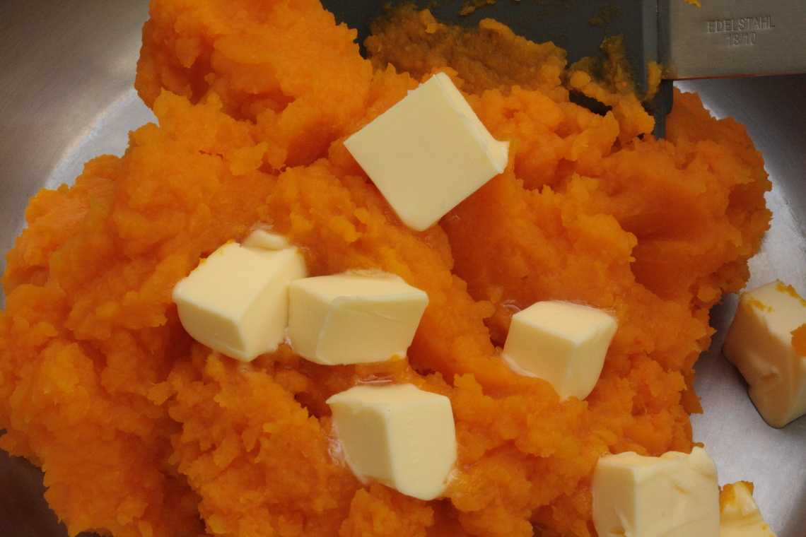 - Die weich gebackenen Kürbisspalten noch heiß pürieren und in das heiße Mus die 40 Gramm Butter einrühren.