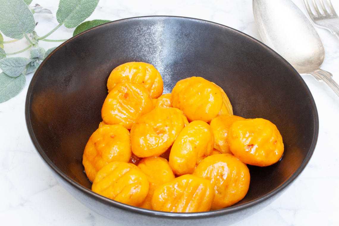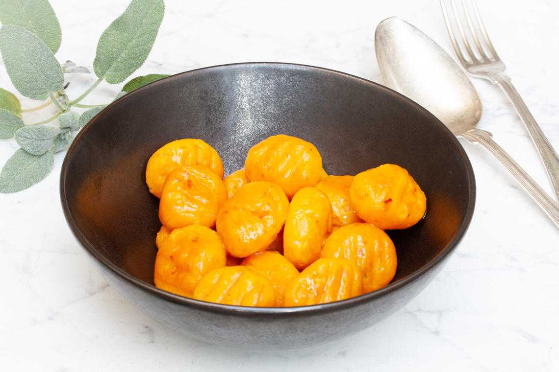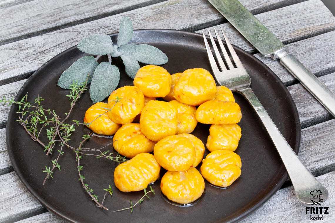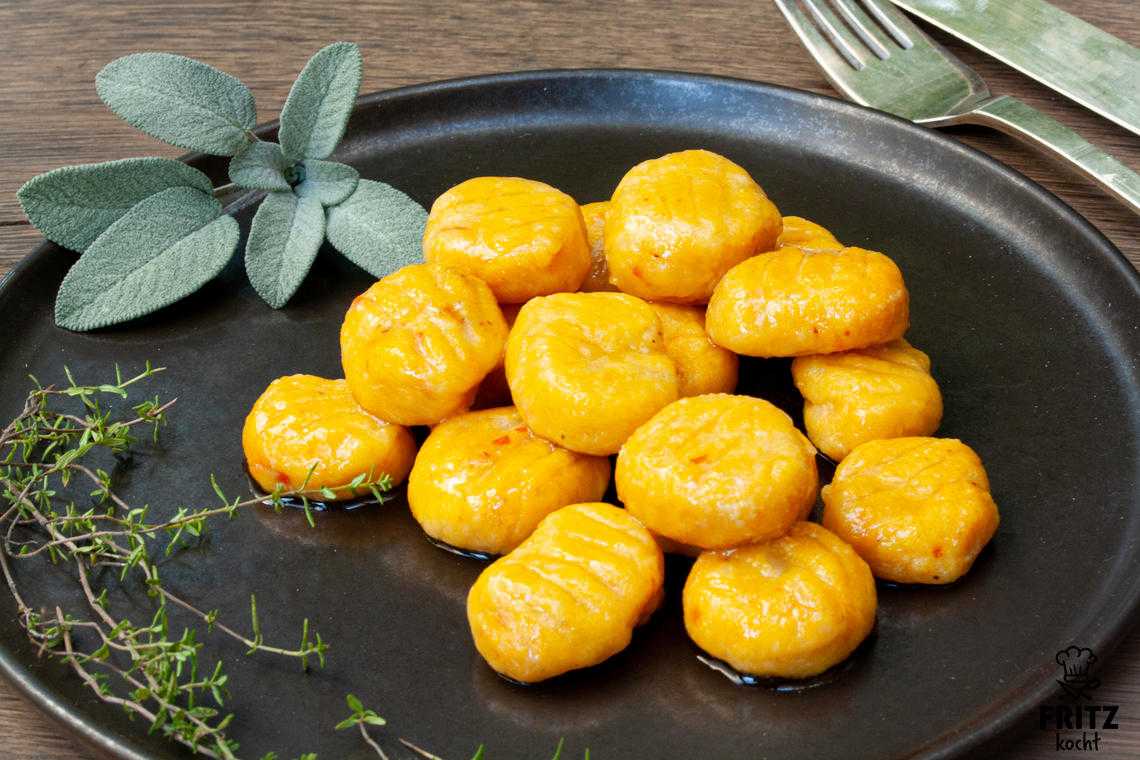 Diese Gnocchis sind nur mit Kürbis. Sie sind noch intensiver im Geschmack als die Gnocchis mit Kürbis und Kartoffeln. Der Teig ist etwas empfindlicher.