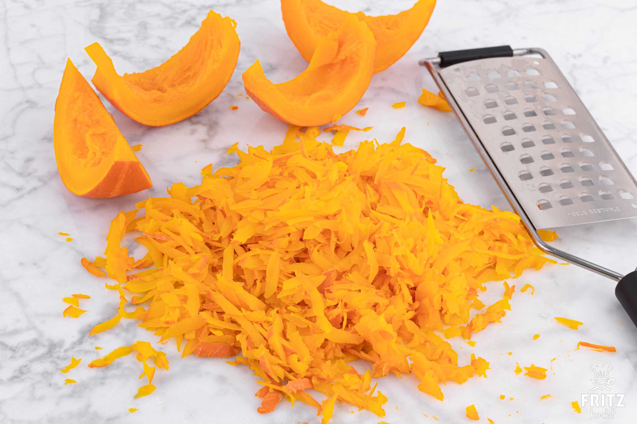- Einen kleinen (ca. 400-500 Gramm) Kürbis in einen Topf mit kochendem Wasser überbrühen und ca. 5 Minuten leicht köcheln lassen. Dann herausnehmen, abkühlen lassen und halbieren. Kerne mit einem Löffel entfernen. 200 Gramm Kürbis schneidet ihr in Stücke und reibt sie auf einer groben Reibe. (Siehe Foto). Den geriebenen Kürbis gebt ihr in den Pfannkuchenteig.