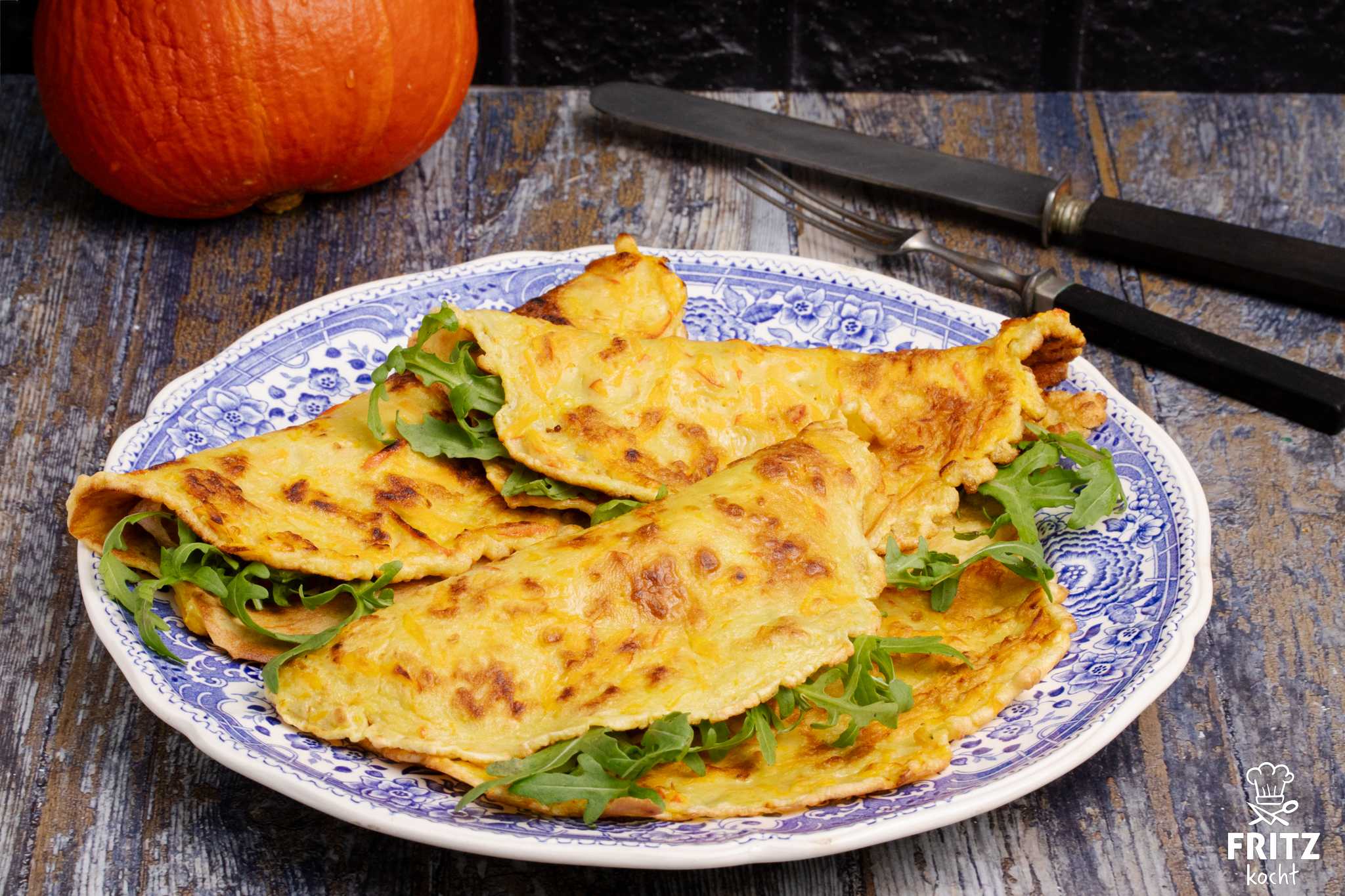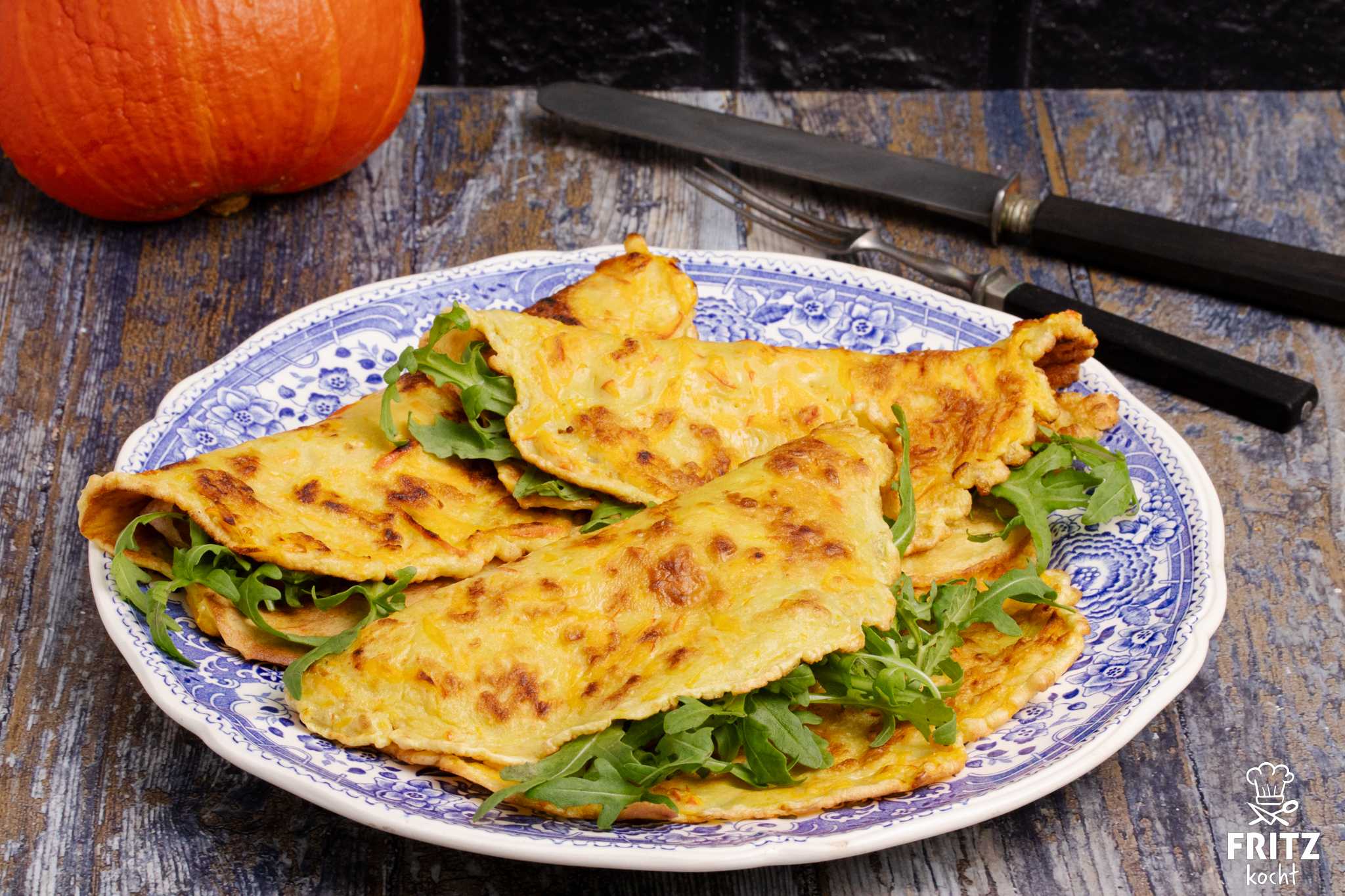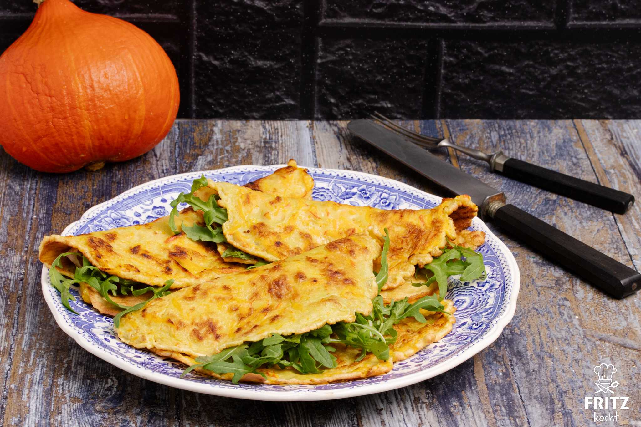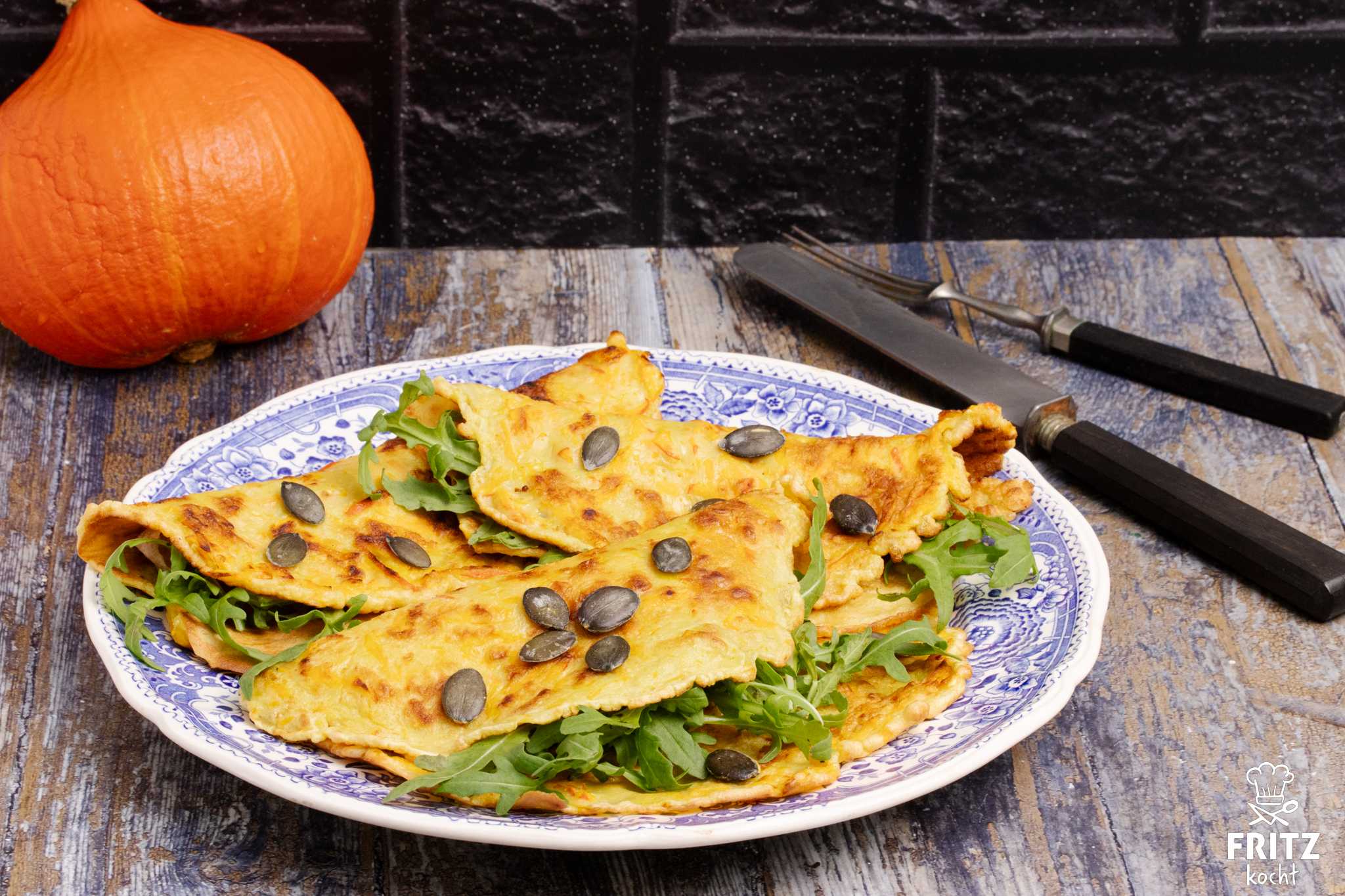 Hokkaido Pfannkuchen, leuchtend orange mit frischem Salat und knackigen Kürbiskernen, ein herbstliches Wohlfühlessen. Schmeckt nicht nur Kinder, die lieben die ganze Familie.