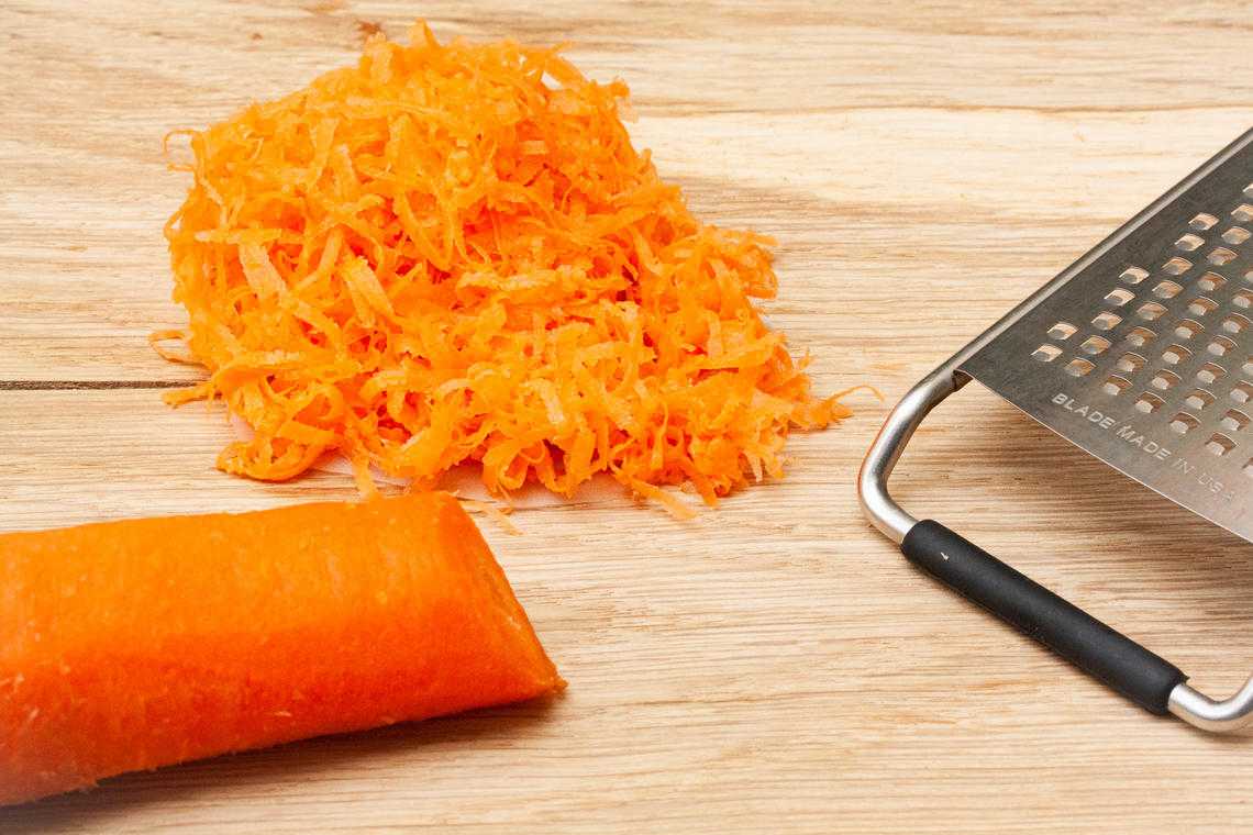- 500 Gramm Möhren waschen, eventuell schälen und entweder mit der Hand auf einer Reibe, das klappt super, oder mit Hilfe einer Küchenmaschine klein raspeln. Ich benutze gerne die etwas gröbere Schneide.