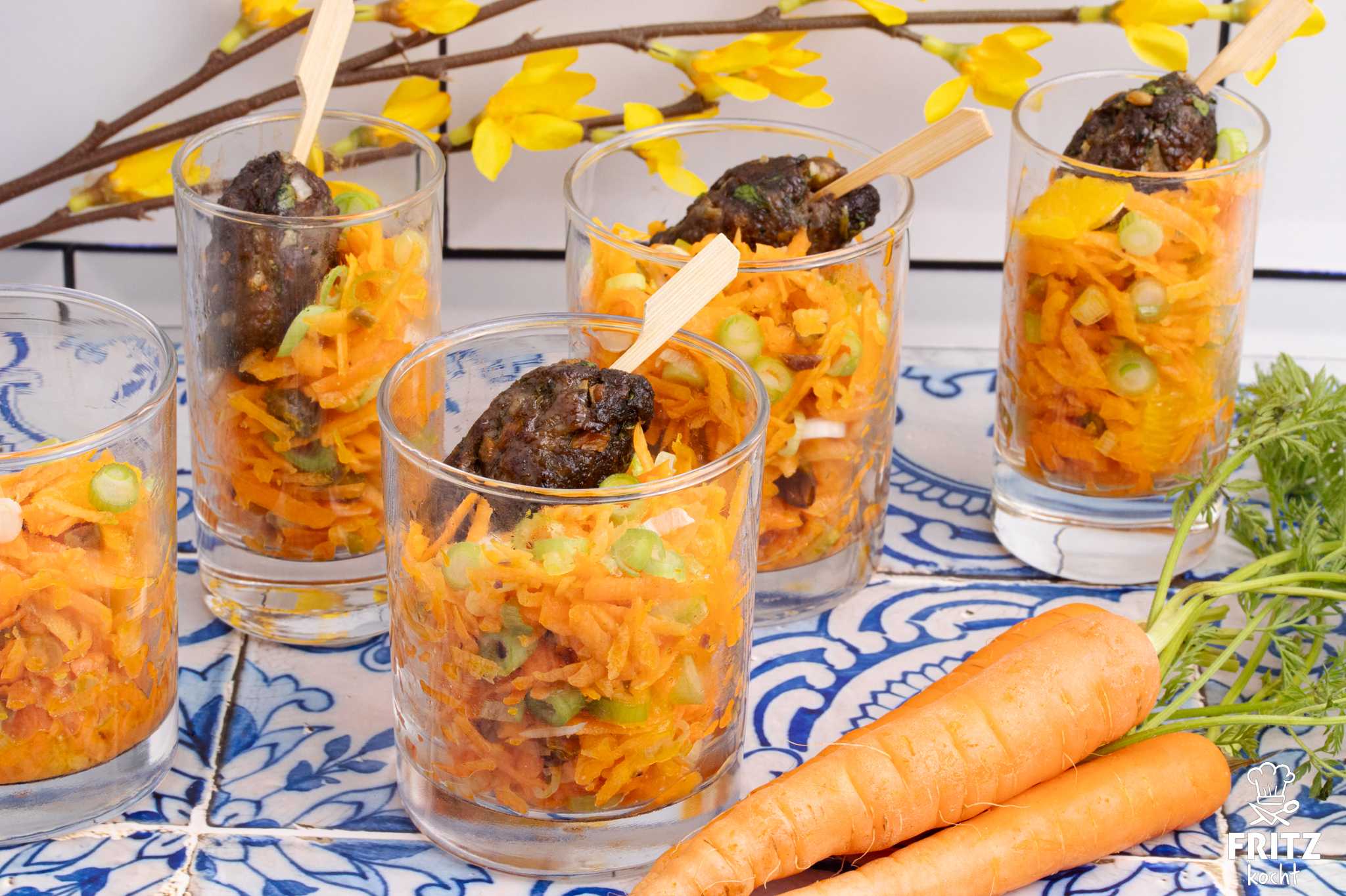 - Für die Köfte mischst du 300 Gramm Rinderhack, 1 kleingewürfelte kleine Zwiebel, 20 Gramm gehackte Petersilie,20 Gramm grob gehackte Pistazien und etwas Pfeffer und Salz. Ich rolle dann etwas längliche Köfte in meiner Hand. Bei mir ergeben es 12 längliche Köfte. Ich gebe etwas Öl über die Köfte und backe sie bei 180°C für 15 Minuten im Airfryer. Nach der Hälfte der Zeit wende ich die Köfte einmal. Danach spieße ich sie auf und gebe sie zu dem Möhrensalat.