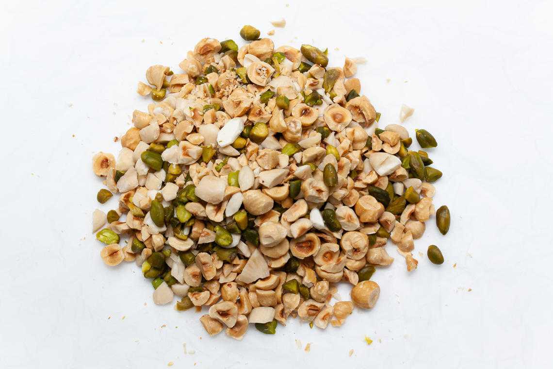 - 200 Gramm Nüsse (z.B. Haselnüsse, Mandeln, Walnüsse, Pistazien....) in Stücke hacken.