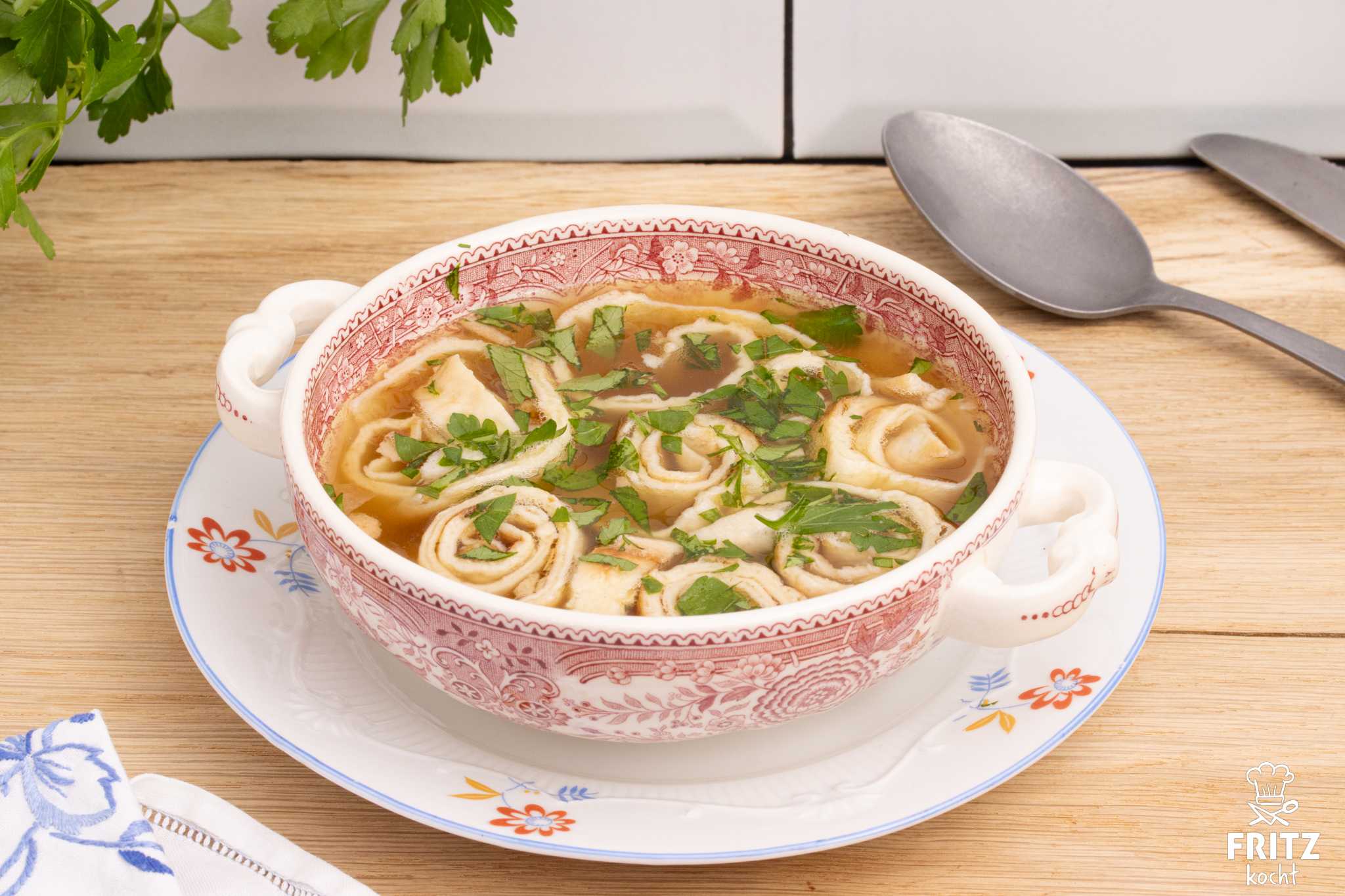 - Nun gibst du erst den Pfannkuchen in die Suppenschüsseln, dann die heiße Brühe und zum Schluß bestreust du alles mit gehackter Petersilie.
