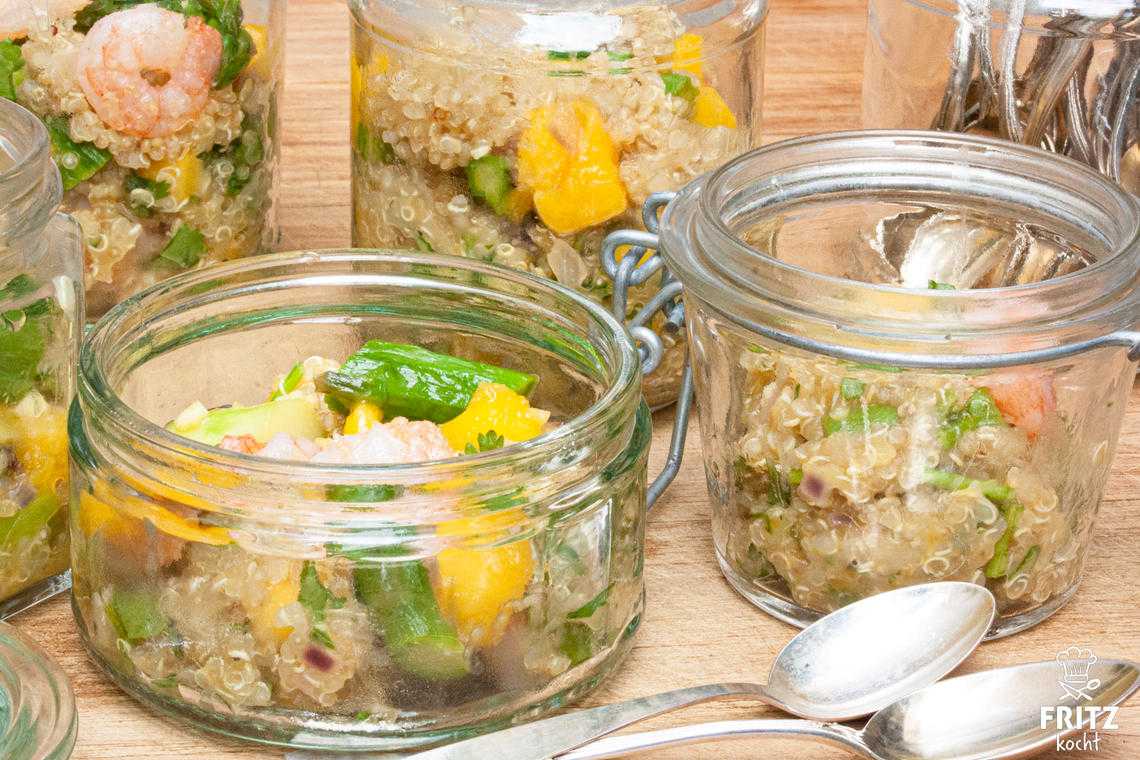 - 2 Esslöffel Öl erhitzen und den Spargel mit dem Zitronengras kurz anbraten, maximal 5 Minuten, so dass er knackig bleibt, salzen, pfeffern, probiert ihn.Alles mit 1 Tasse Orangensaft ablöschen und den Ingwer mit hineingeben. Pfanne vom Herd nehmen und alles unter den Quinoa heben. Vorsichtig die Mango und den Koriander dazugeben und den Salat mit Salz und Pfeffer abschmecken.