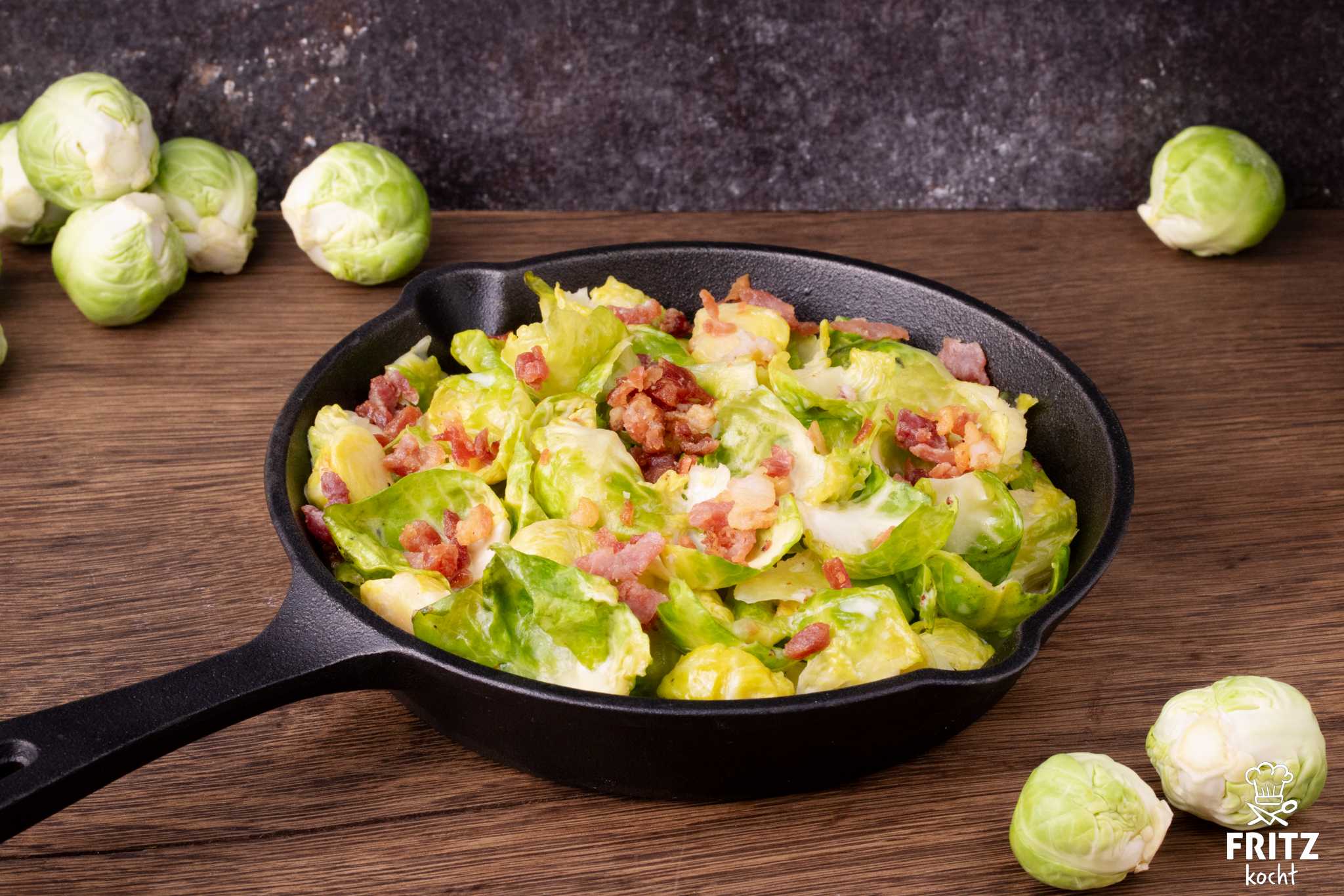 - Den Rosenkohl mit hinzugeben umrühren und mit 200 ml Sahne ablöschen. Den Deckel auf den Topf geben und ca. 3-5 Minuten leicht köcheln lassen, so dass die Blätter noch Biss haben. Mit Salz, Pfeffer und geriebener Muskatnuss abschmecken. Dann mit dem Speck bestreuen und mit Brot oder Kartoffelpüree essen.