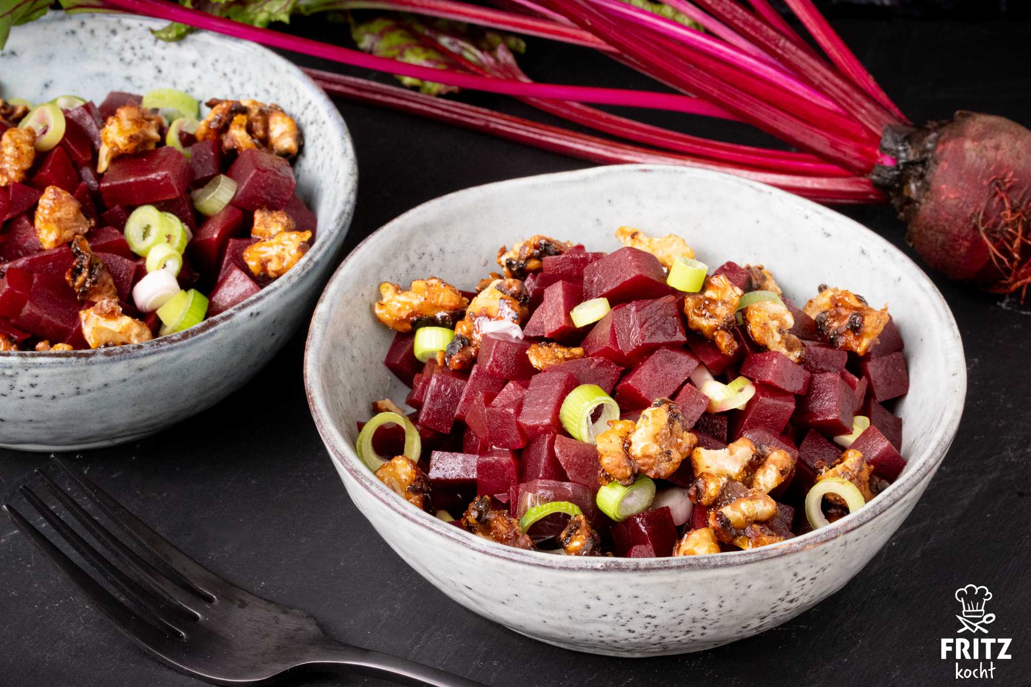 Mein Rote Bete Salat Rezept ist mit karamelisierten Walnüssen und dieser Chrunch ist ein Träumchen. Ihr könnt diesen Salat auch mit fertig gekaufter Rote Bete zubereiten, aber selber gekocht, geht wirklich einfach und ich finde, es schmeckt besser.