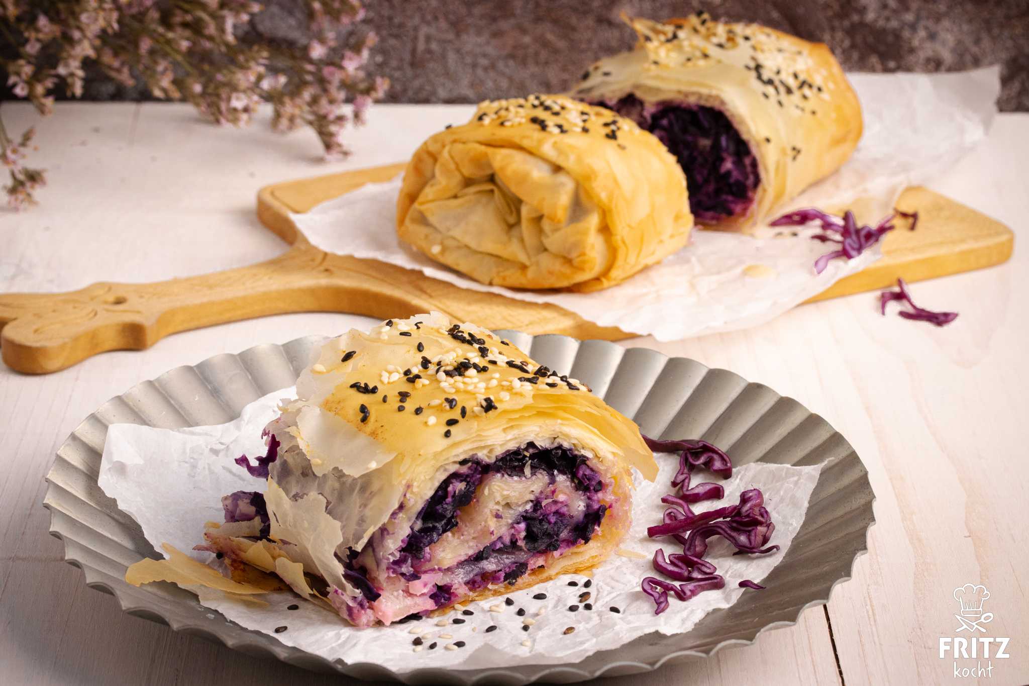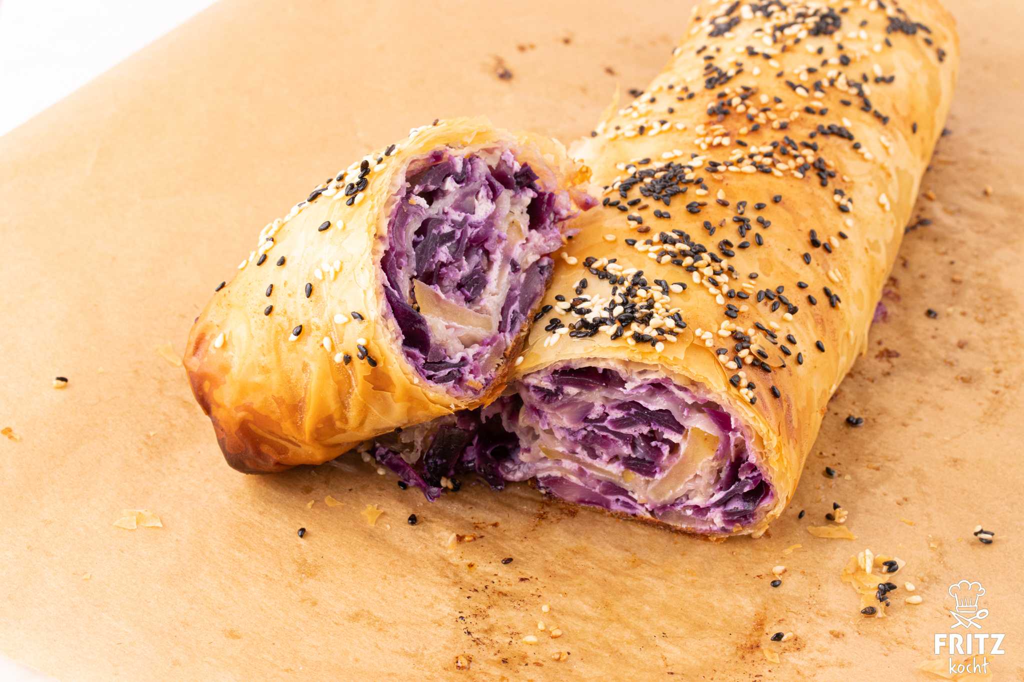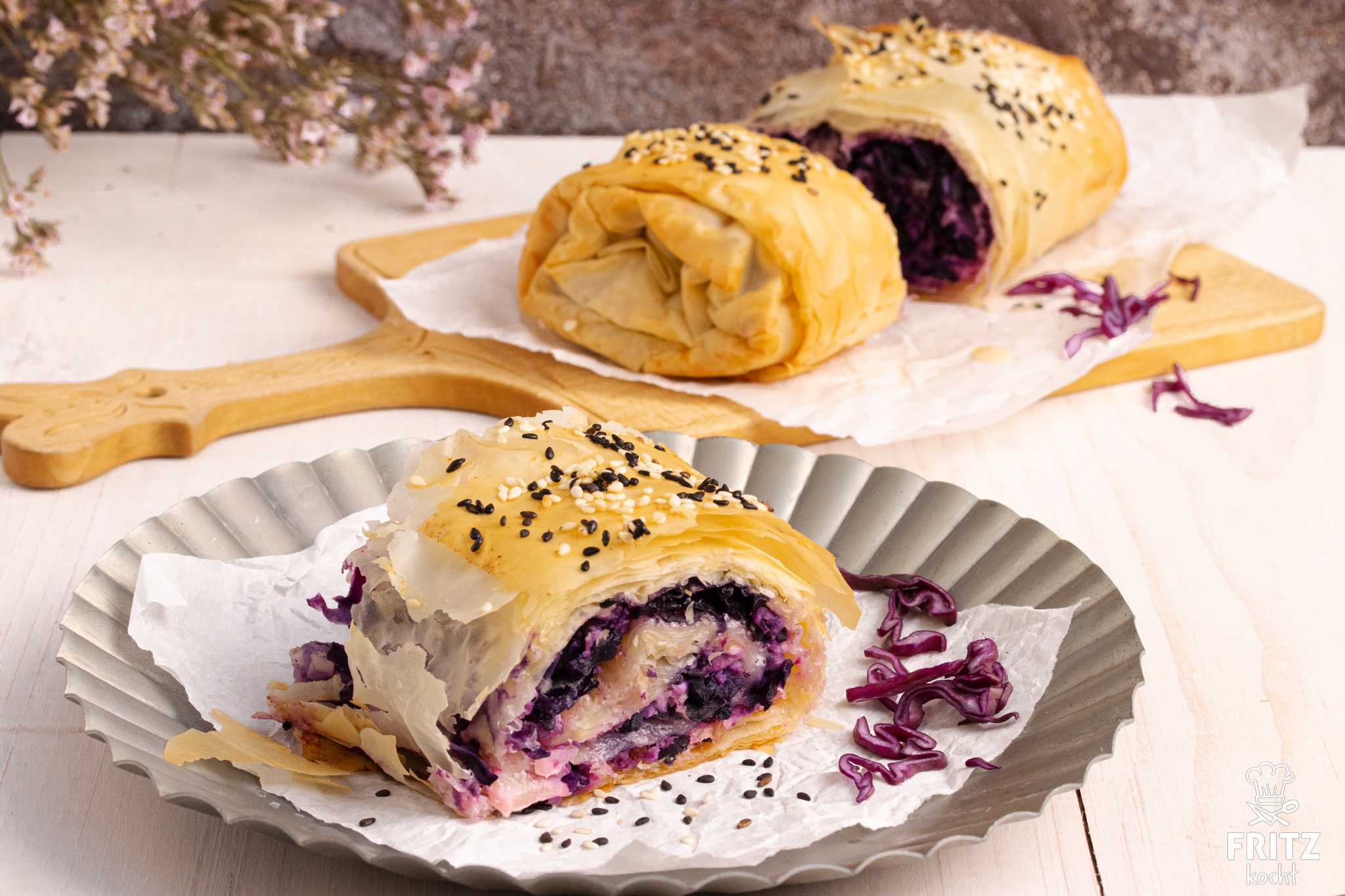 Knuspriger Rotkohl-Strudel - das perfekte Weihnachtsgericht. Außen goldbraun und knusprig, innen aromtisch mit würzigem Rotkohl. Einfach zu backen und ein echtes Highlight auf der Festtafel. Ideal als Vorspeise oder vegetarisches Hauptgericht.