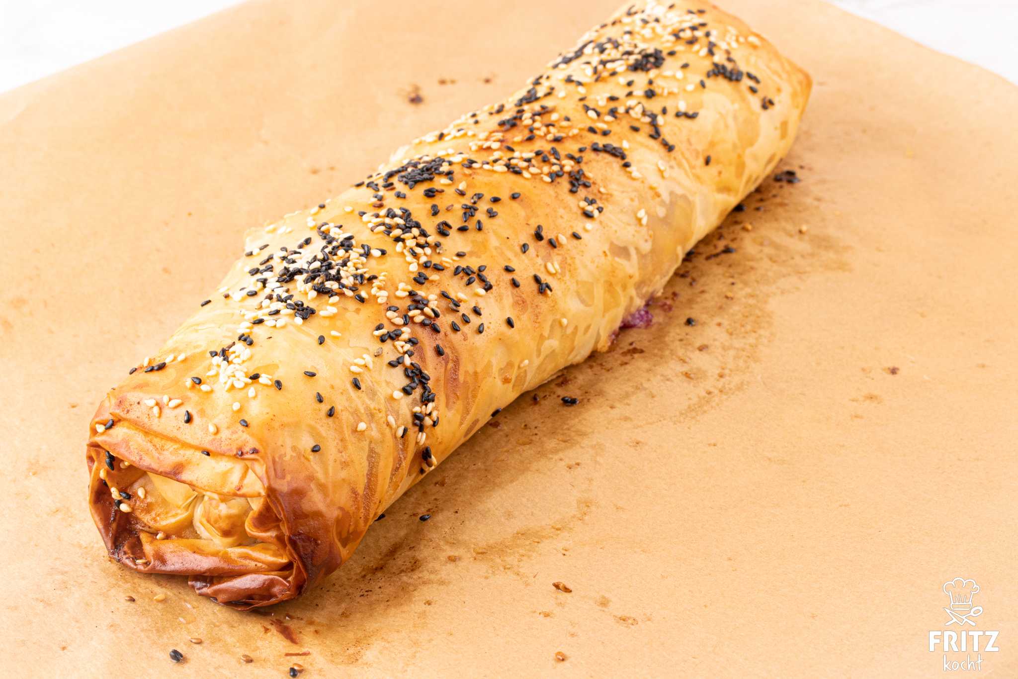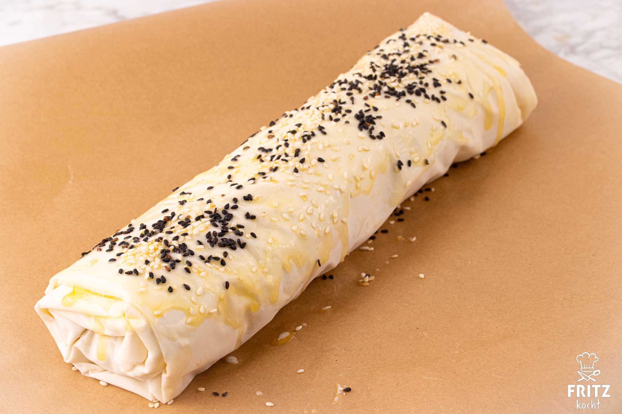 - Nun legt ihr vor euch ein Teigblatt, (meine Blätter waren ca.35 cm x 45 cm groß) bestreicht es mit flüssiger Butter. In der Mitte verteilt ihr etwas von eurer Füllung. Die Ränder bitte freilassen. Jetzt schlagt ihr die Seiten ein Stück Richtung Mitte um bestreicht die umgeklappten Teigränder wieder mit etwas Butter und rollt den Strudel von vorne nach hinten auf. Ihr legt ihn mit der Nahtstelle nach unten auf ein mit Backpapier ausgelegtes Backblech und bestreicht ihn mit etwas Butter und wer mag, streut schwarzen Sesam darüber. Das macht ihr mit allen Blättern und der ganzen Füllung.