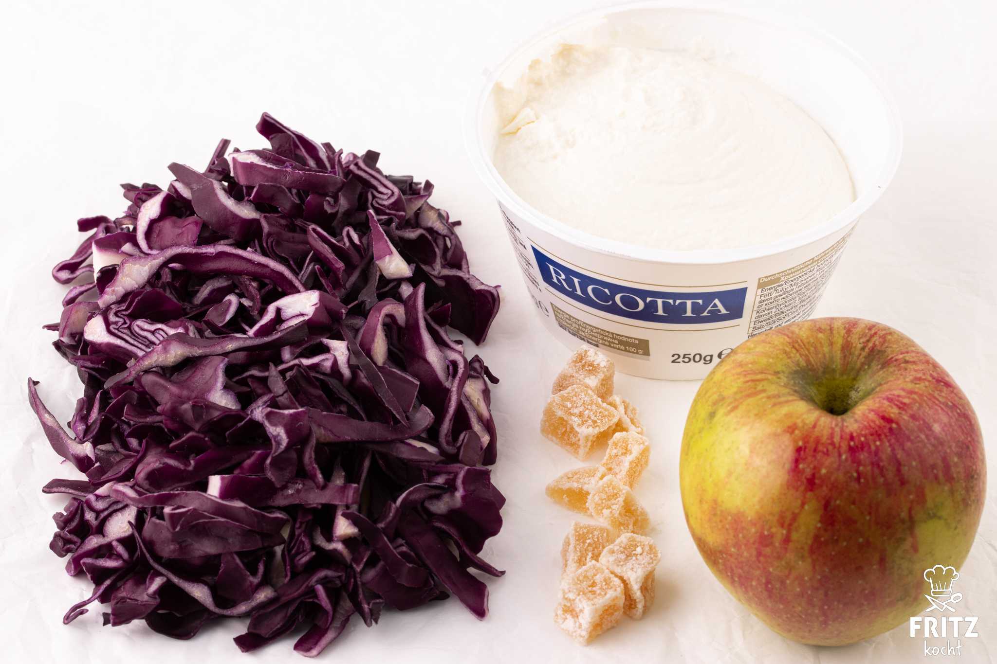 - Nun mischt ihr den Rotkohl mit dem Apfel, 250 Gramm Ricotta, 1 Ei, dem kleingeschnittenen Ingwer und 1 Teelöffel Salz gut durch.
