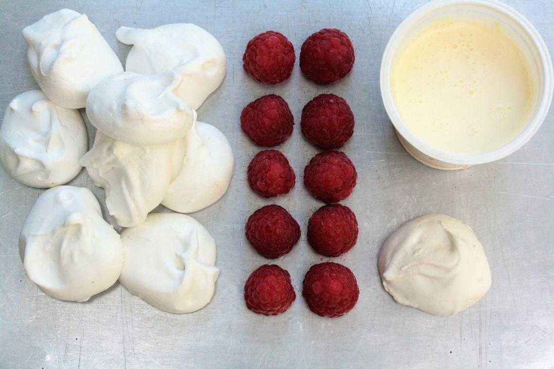 - Nun die drei Zutaten in einer großen Schüssel wie folgt schichten: 1. Baiser, 2. tiefgefrorene Himbeeren, 3. Schlagsahne. Das so lange wiederholen, bis alles aufgebraucht ist und die letzte Schicht Sahne ist, die ihr mit ein paar frischen Himbeeren verzieren könnt.