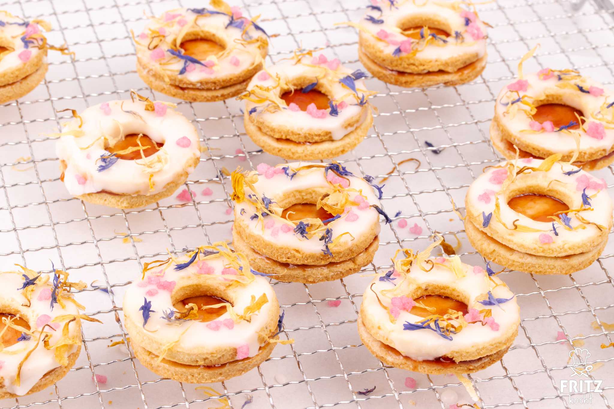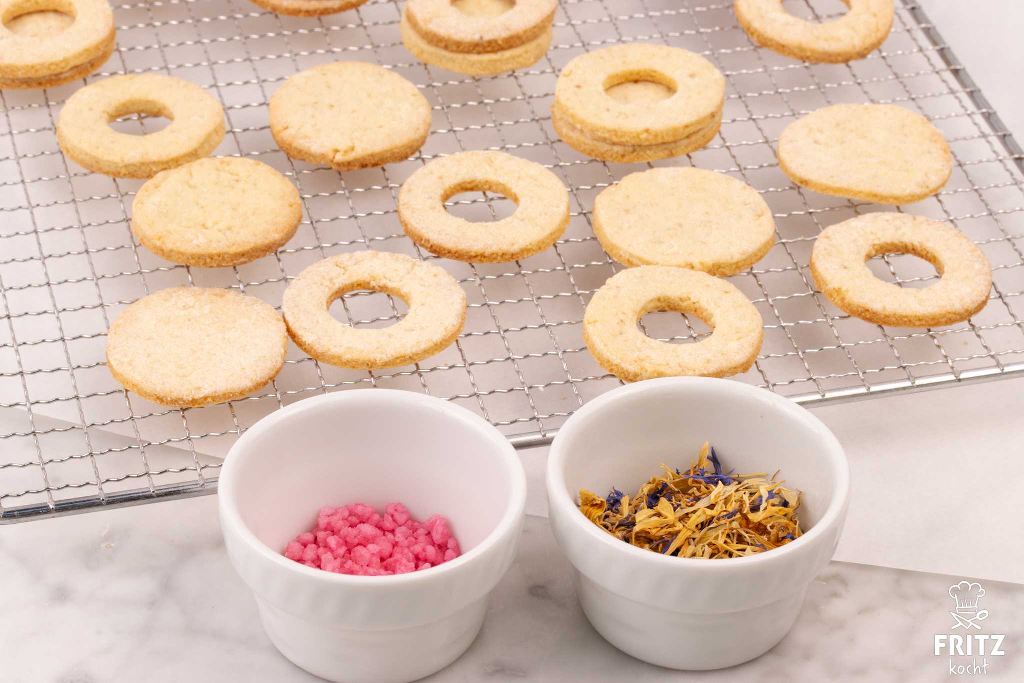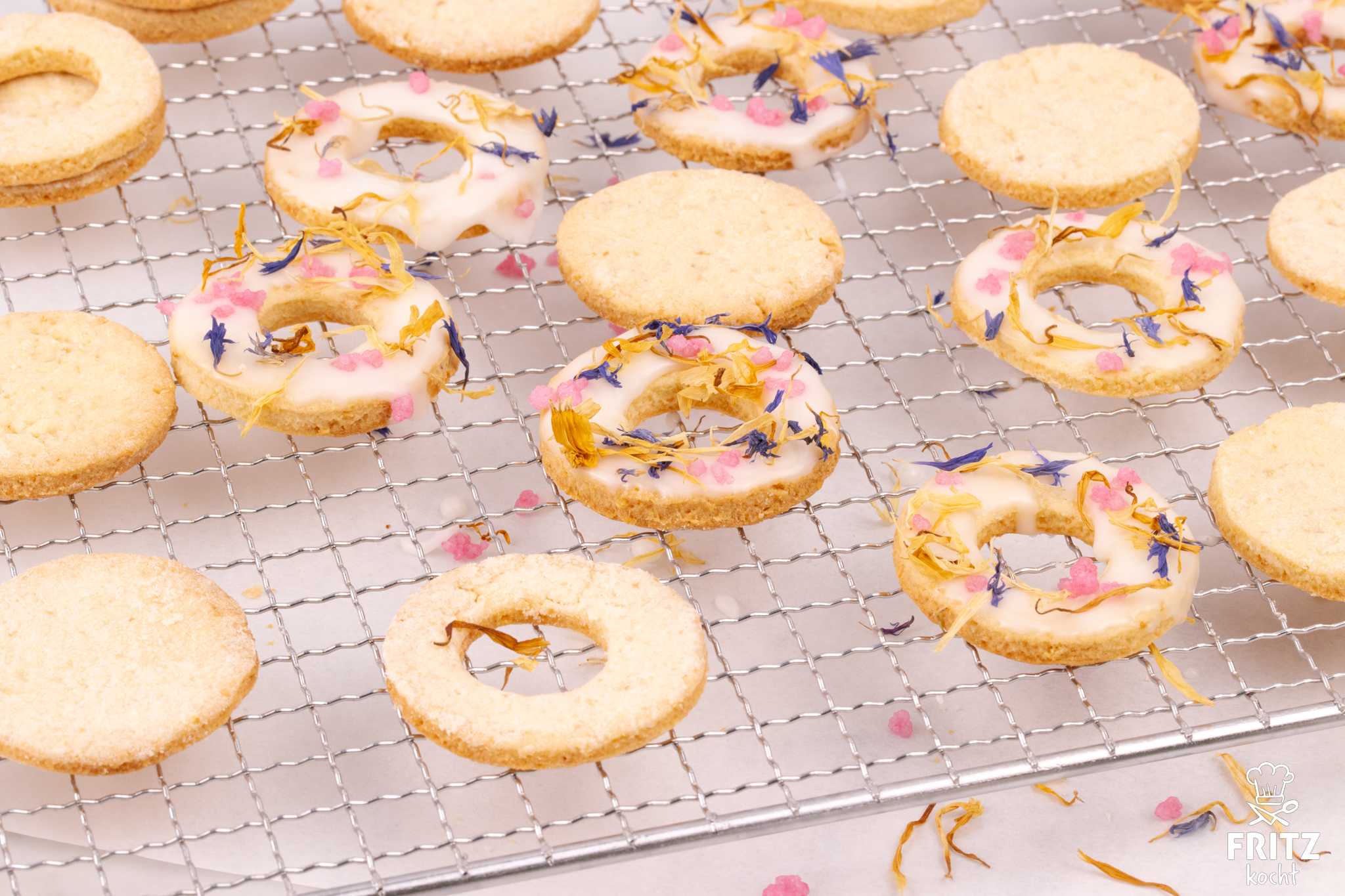 - Nach dem Backen die Plätzchen bitte abkühlen lassen. Sie sind dann stabiler und ihr könnt sie besser weiter verarbeiten.Ihr mischt den Puderzucker mit etwas Zitronensaft zu einer Glasur und bestreicht die Ringe damit. Dann könnt ihr die Ringe verzieren wie ihr möchtet. Ich habe getrocknete Blüten genommen und ein paar kandierte Rosenblätter.