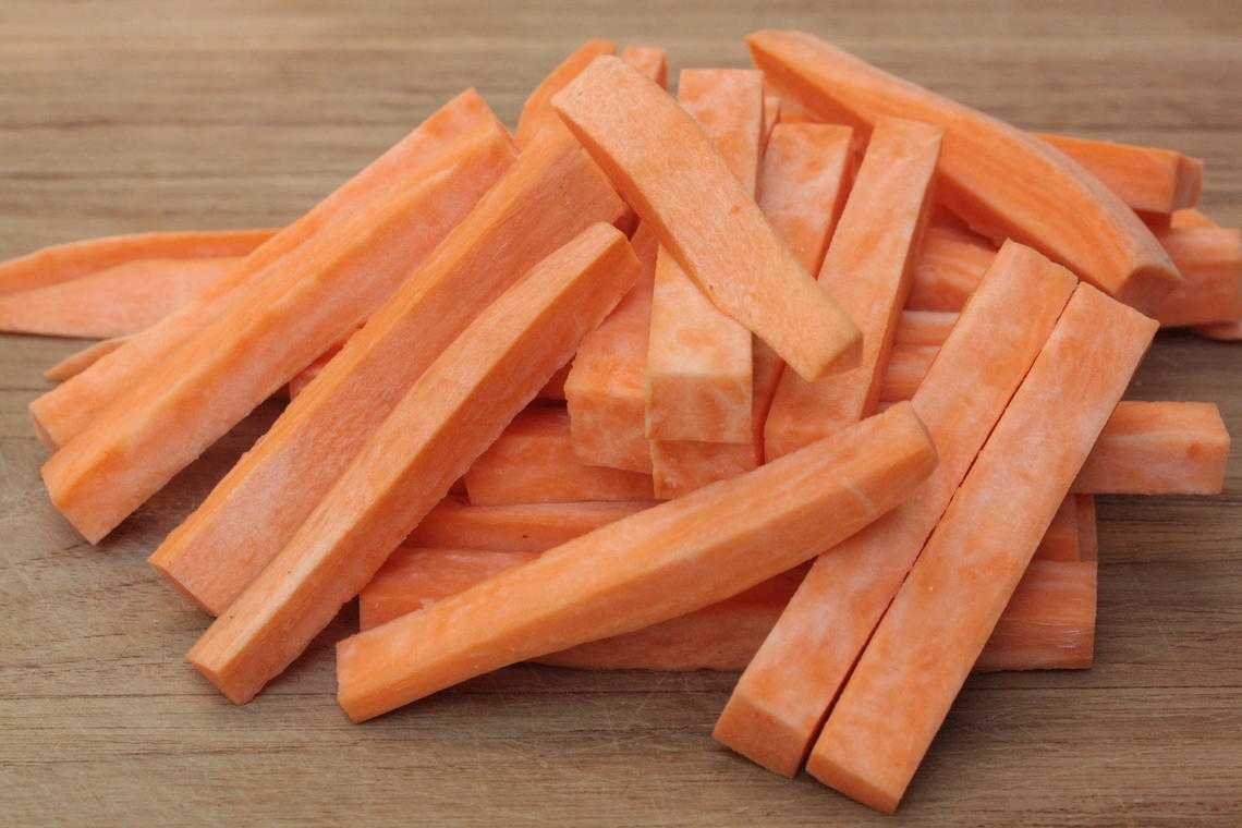 - Süßkartoffeln waschen und in Stifte schneiden. Ihr könnt sie sowohl mit Schale als auch ohne frittieren. Ich empfehle euch keine Pommespresse zu nehmen. Ich habe meine Presse geschrottet, weil ich nicht glauben wollte, dass die Süßkartoffeln härter sind als normale Kartoffeln, warum auch immer :(