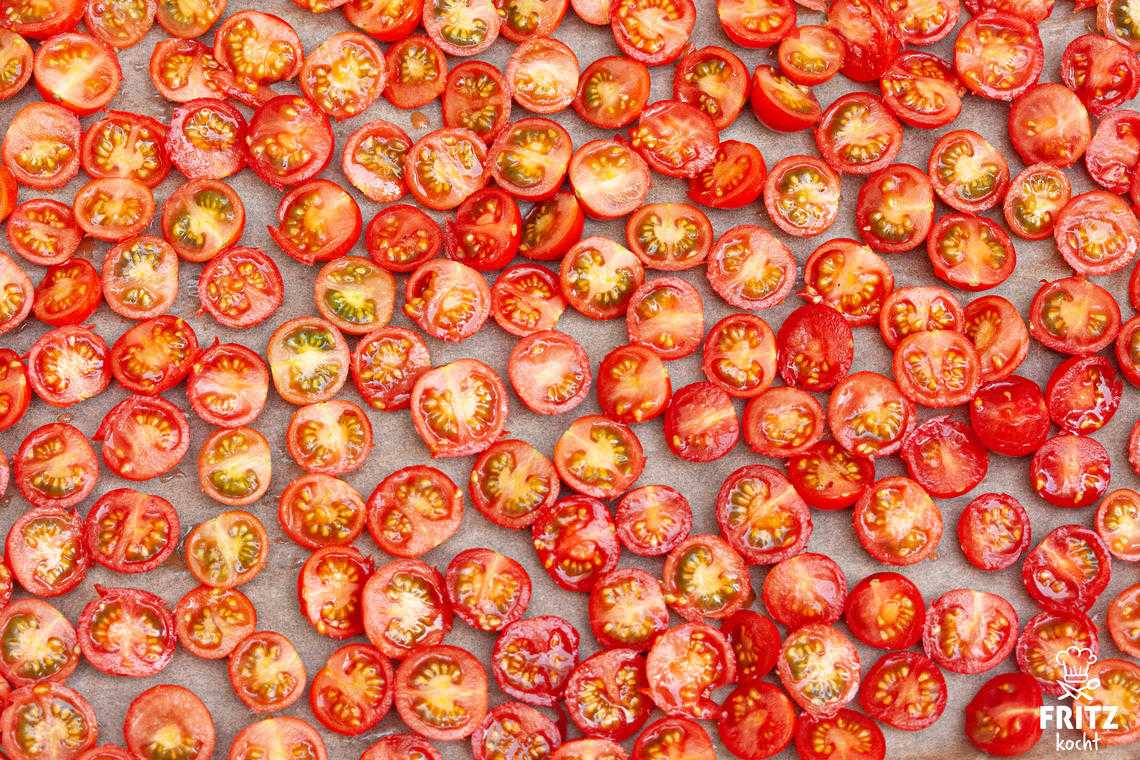 - Ca. 600 Gramm Tomaten waschen und kleine Tomaten halbieren, große vierteln. Auf ein mit Backpapier ausgelegtem Backblech verteilen und mit 2 Esslöffeln Öl, 2 Esslöffeln Essig und etwas Salz bestreuen und für ca. 1 Stunde in der Ofenmitte trocknen.