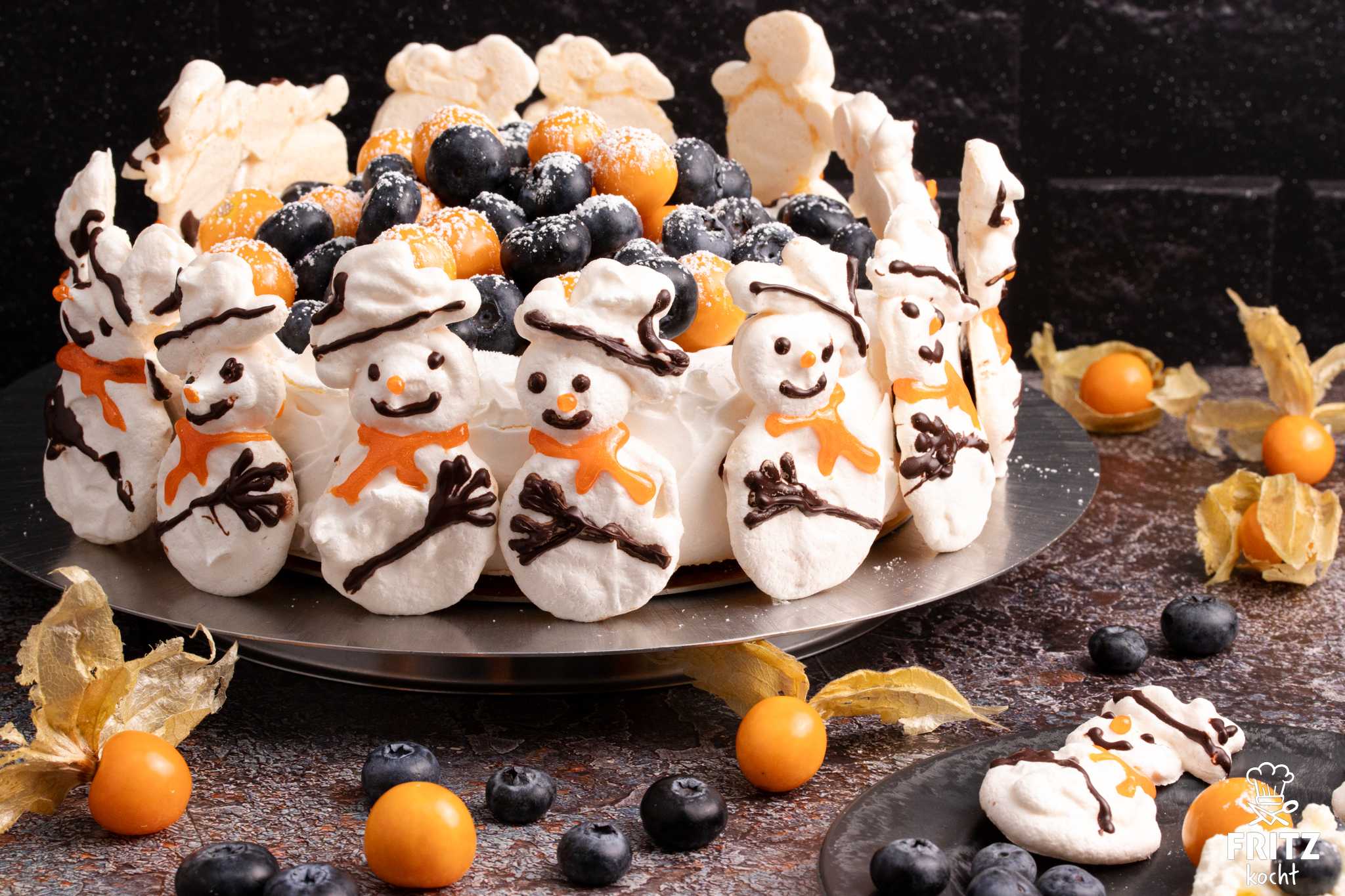 - Jetzt befestigt ihr die Schneemänner mit etwas flüssiger Schokolade am Pavlova Rand. Bei mir passen 14 Stück um den ganzen Rand herum.