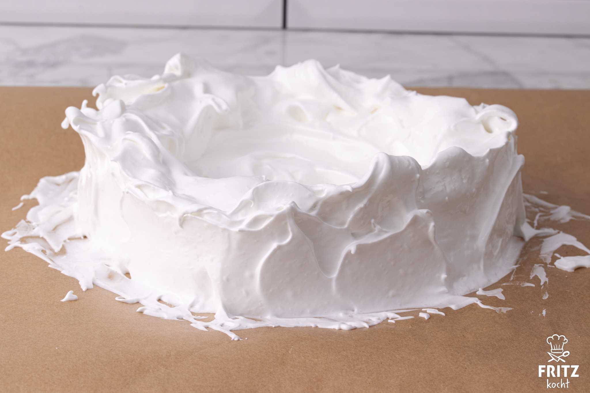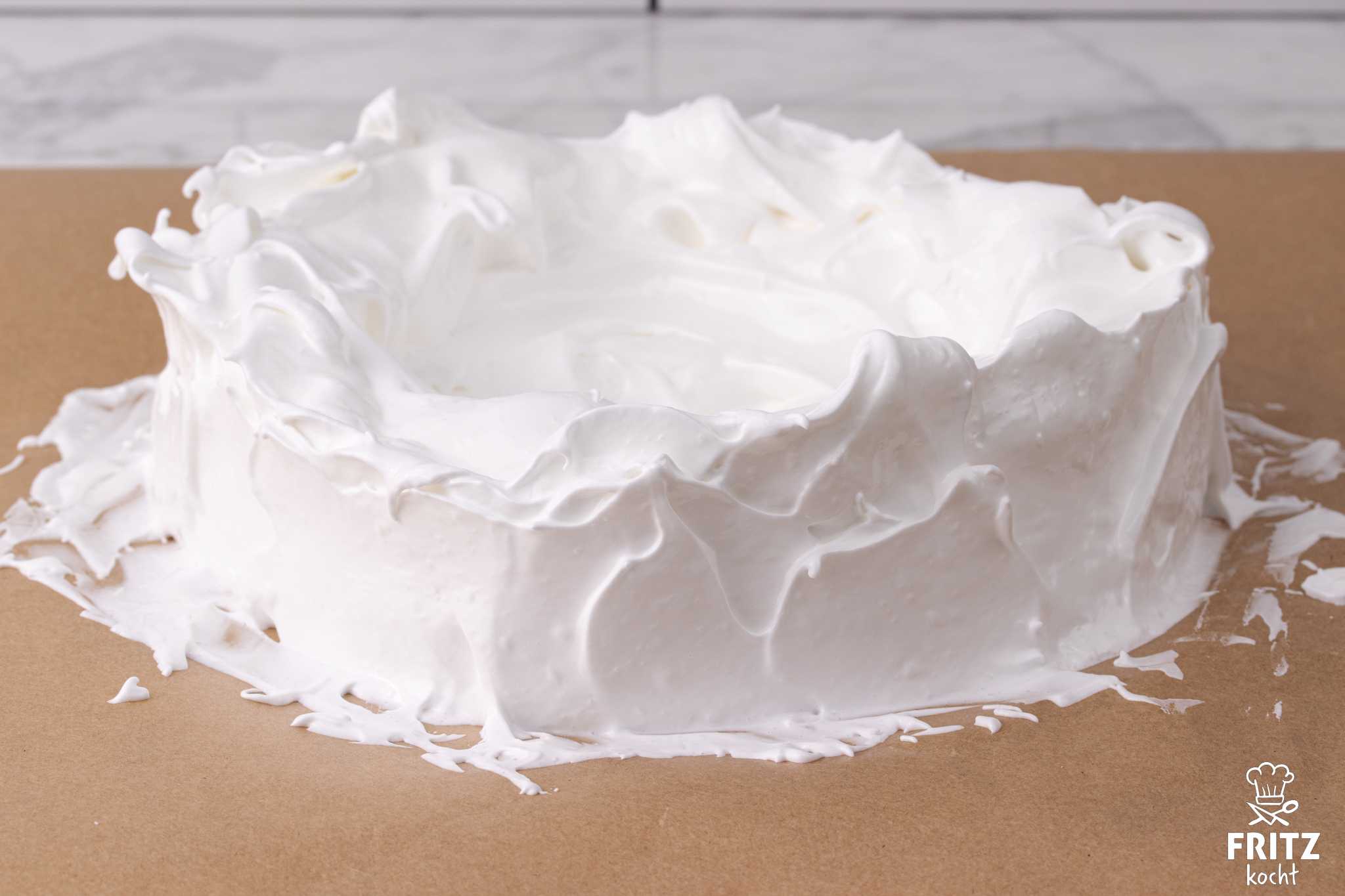- 4 Eiweiße mit einer Prise Salz steif schlagen und nach und nach 200 Gramm Zucker dazu geben. Der Eischnee bitte so lange steif schlagen, bis er glänzt und ganz steif ist. Das dauert ca. 5-8 Minuten.Den ganzen Eischnee in der Mitte eines Backpapiers aufhäufen. Nun langsam einen dicken Kreis formen von ca. 20 cm Duchmesser. Jetzt bildet ihr in der Mitte mit einem Esslöffel eine Mulde und zieht den Eischnee am Rand etwas hoch. Es entsteht quasi eine Form wie ein Planschbecken. Zum Schluss zieht ihr mit einem Messer den Rand außen von unten nach oben hin weg. Dadurch entsteht eine glatte Fläche, an die später die Schneemänner geklebt werden. Siehe Foto.Den Pavlova im Backofen 3-4 Stunden trocknen lassen. Bitte öffnet zwischendurch die Ofentüre, damit die feuchte Luft entweichen kann. Ihr könnt zwischendurch fühlen, wie feste der Pavlova schon ist. Da er ziemlich dick ist, braucht er lange zum Trocknen. Wenn er durchgetrocknet ist, lasse ich den Pavlova im Ofen. Ich habe ihn schon 3 Tage im Ofen gelassen, ehe ich ihn weiterverarbeitet habe. Das klappt super. Er darf nur nicht wieder feucht werden. Dann klebt er und wird weich :(
