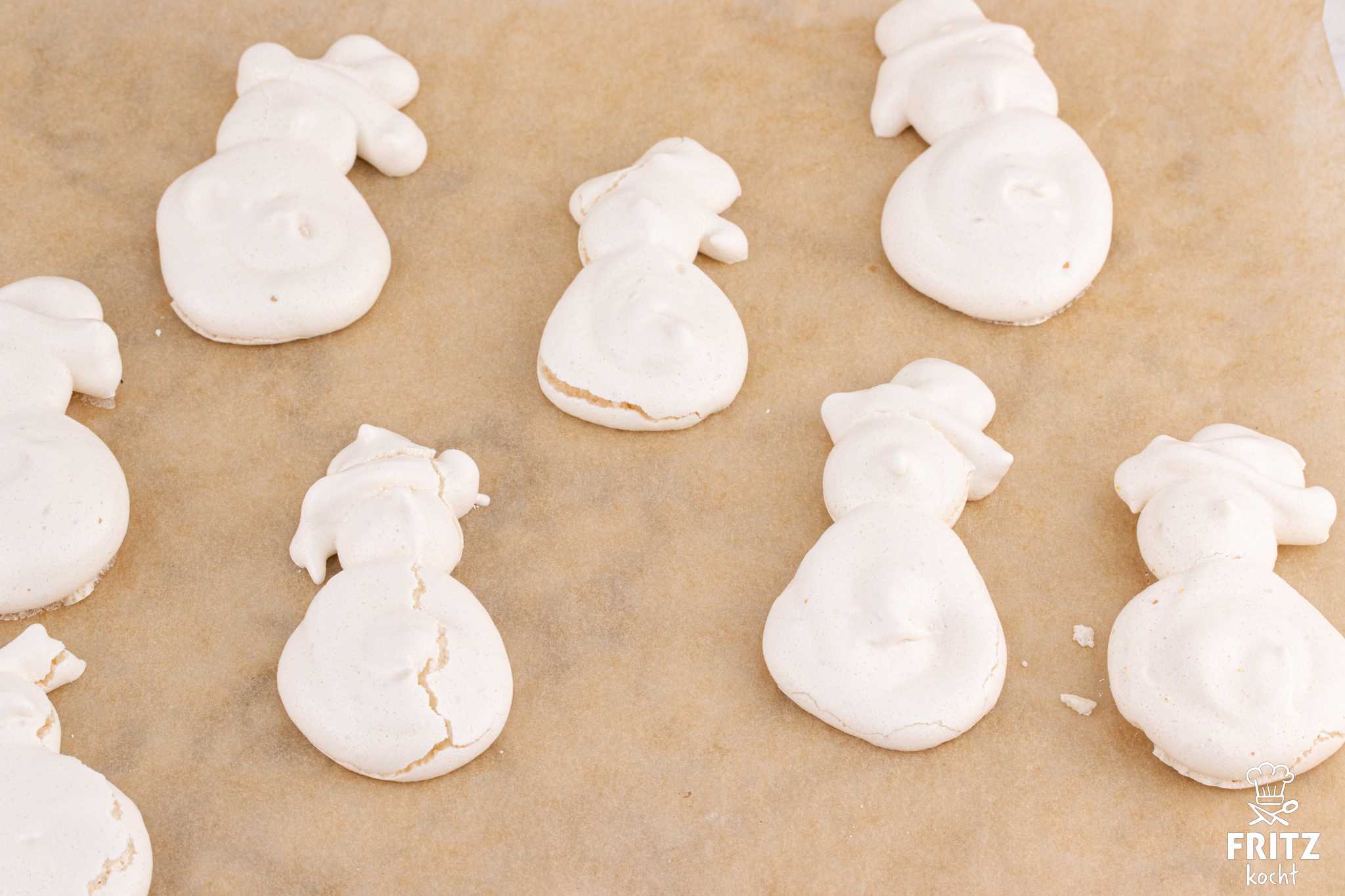 - Für die Schneemänner 2 Eiweiße mit einer Prise Salz steif schlagen und nach und nach 100 Gramm Zucker dazugeben. Den Eischnee wie oben so lange schlagen, bist er fest ist und glänzt. Nun gebt ihr den Eischnee in einen Spritzbeutel mit einer runden Tülle und spritz auf das Backpapier erst einen etwas größeren Kreis (den Bauch vom Schneemann) dann oben dran einen kleineren Kreis (den Kopf vom Schneemann). Jetzt wechsel ich die Tülle und nehme eine dünnere Tülle und spritze damit auf den Kopf etwas schräg einen Zylinder. Siehe Fotos.Das macht ihr mit der ganzen Masse. Bei mir ergibt die Masse 20-22 Schneemänner.Diese backt ihr auch im Ofen ca.2 Stunden. Schaut zwischendurch, wie trocken sie schon sind. Wenn sie fertig sind unbedingt in einer Dose verschließen, damit sie keine Feuchtigkeit aufnehmen.