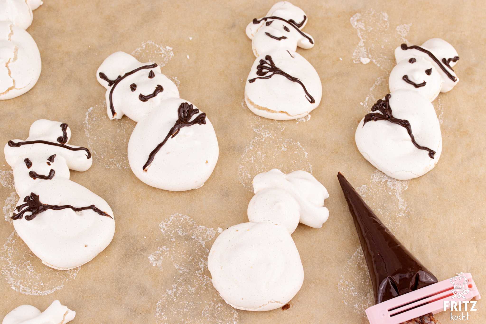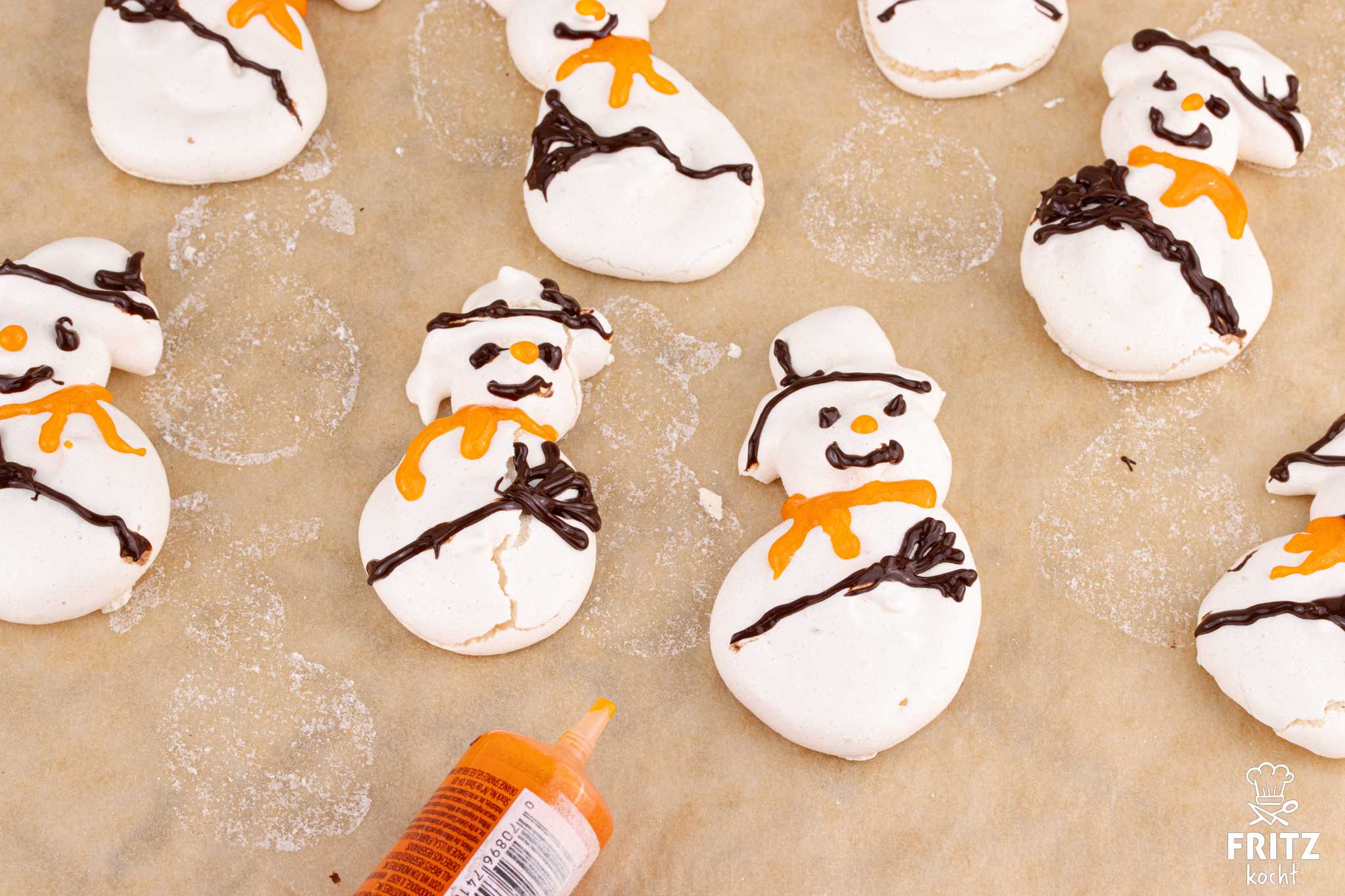 - Für die Dekoration der Schneemänner gebt ihr 60 Gramm dunkle Schokolade in einen kleine Spritzbeutel, verschließt ihn oben mit einer Beutelklammer und gebt über den Spritzbeutel in einer kleinen Schüssel kochendes Wasser. So schmiltzt die Schokolade ganz schnell. Ihr knetet den Beutel durch und schneidet die Spitze ganz klein ab. Sonst werden die Augen zu groß.Ihr spritzt 2 kleine Augen und einen Mund auf das Gesicht, einen Besen quer über den Bauch und wer mag noch etwas Schokolade auf die Krempe des Zylinders. Mit einem orangfarbenen Zuckerstift zieht ihr dem Schneemann noch einen Schal an. Ihr könnt natürlich auch eine andere Farbe für den Schal nehmen ;)