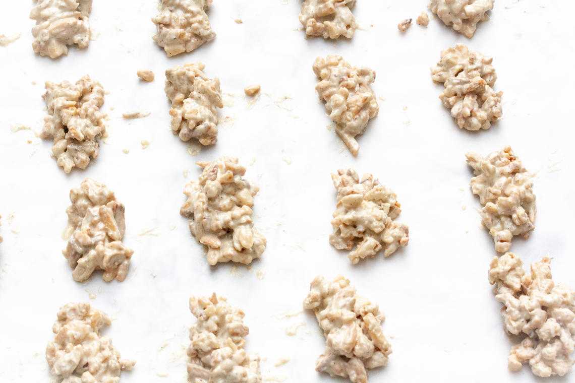 - Die Mandelstifte hebt ihr jetzt vorsichtig unter die Schokolade und setzt kleine Häufchen auf ein Backpapier. Bei mir ergeben es ca. 25 Stück. Wenn sie erkaltet sind, hebt sie vom Papier ab und lagert sie in einer Dose oder esst sie sofort.