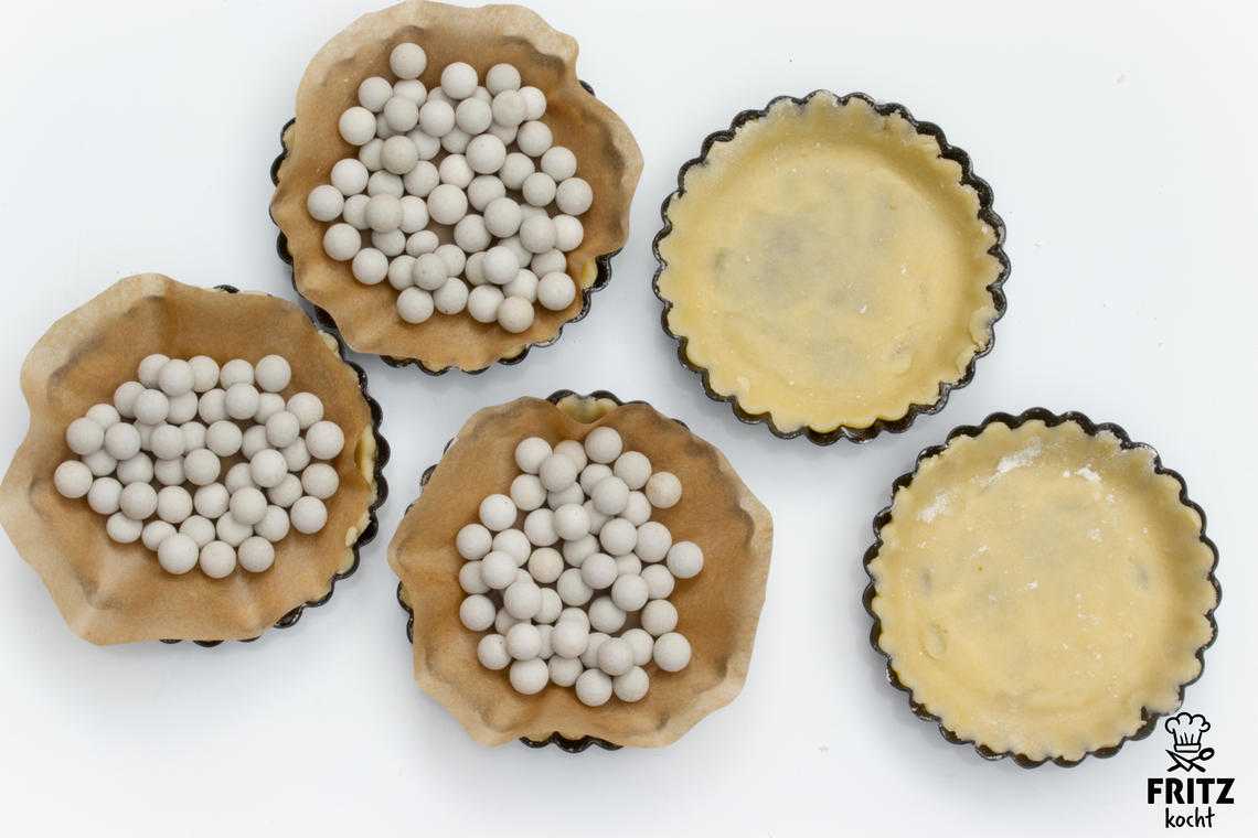 - Den Teig mit Backpapier auslegen, Hülsenfrüchte (siehe Tipp) oder Backperlen (Keramikperlen) darauf verteilen und in der Ofenmitte 12 Minuten backen. Nach den 12 Minuten müsst ihr das Backpapier mit den Backperlen oder Hülsenfrüchten entfernen. Vorsicht, das ist alles heiß. Nun den Teig ohne Papier und Perlen weitere 5 Minuten im Ofen backen. Das nennt man Blindbacken, da nur der Teig flach gebacken wird. Wenn die Böden fertig sind, den Backofen auf 120 °C runterdrehen.
